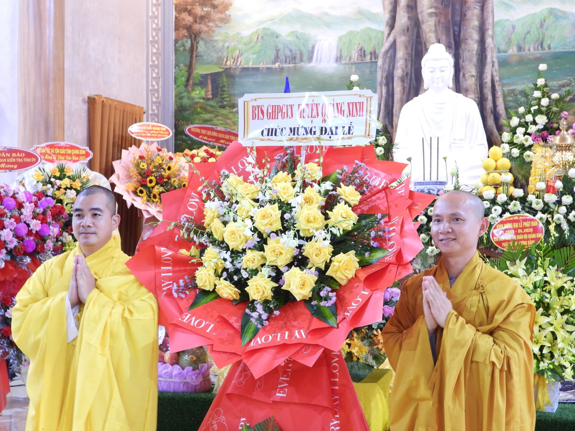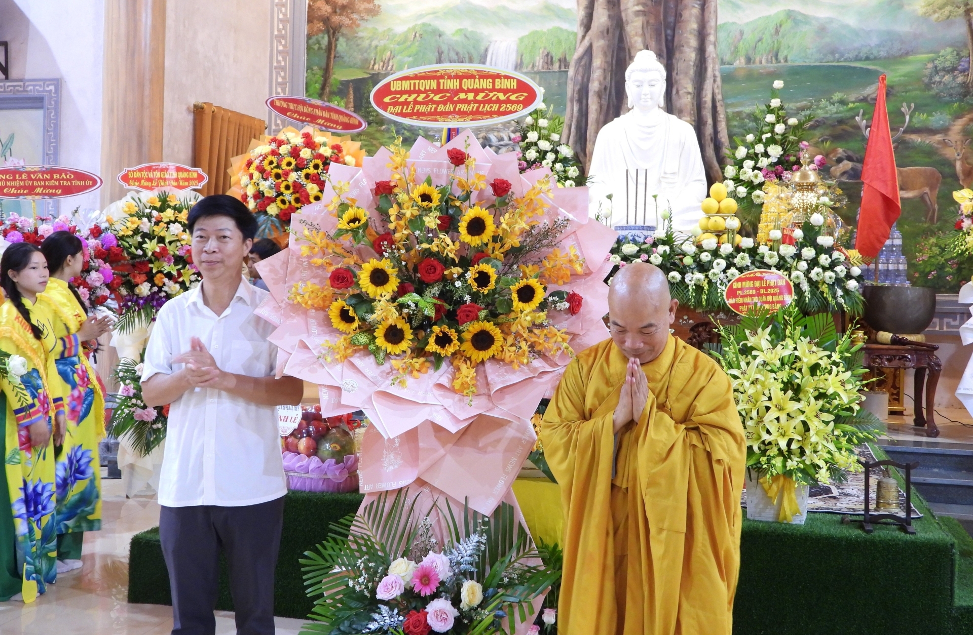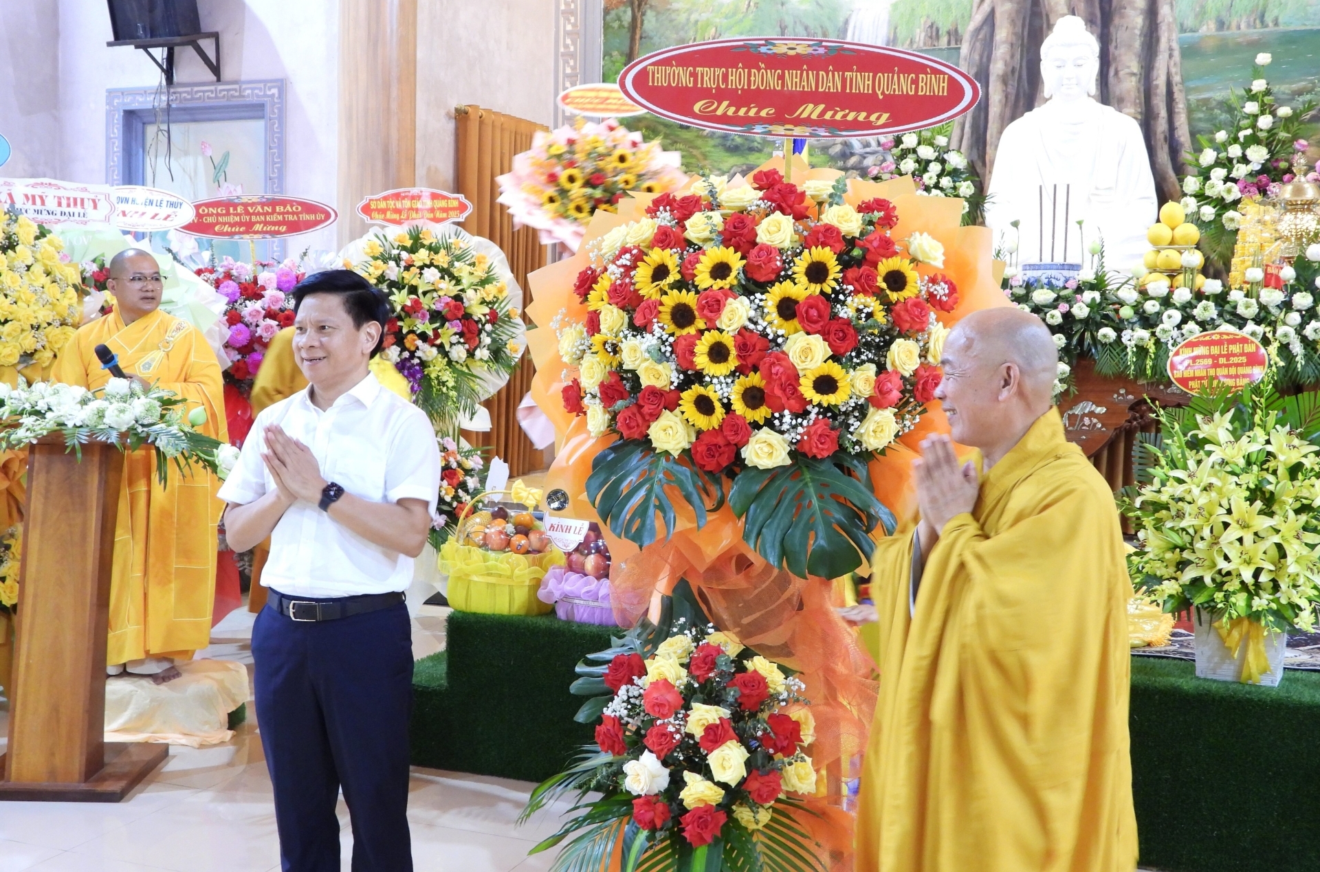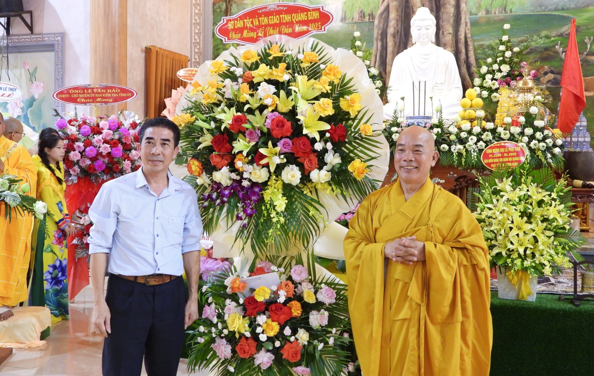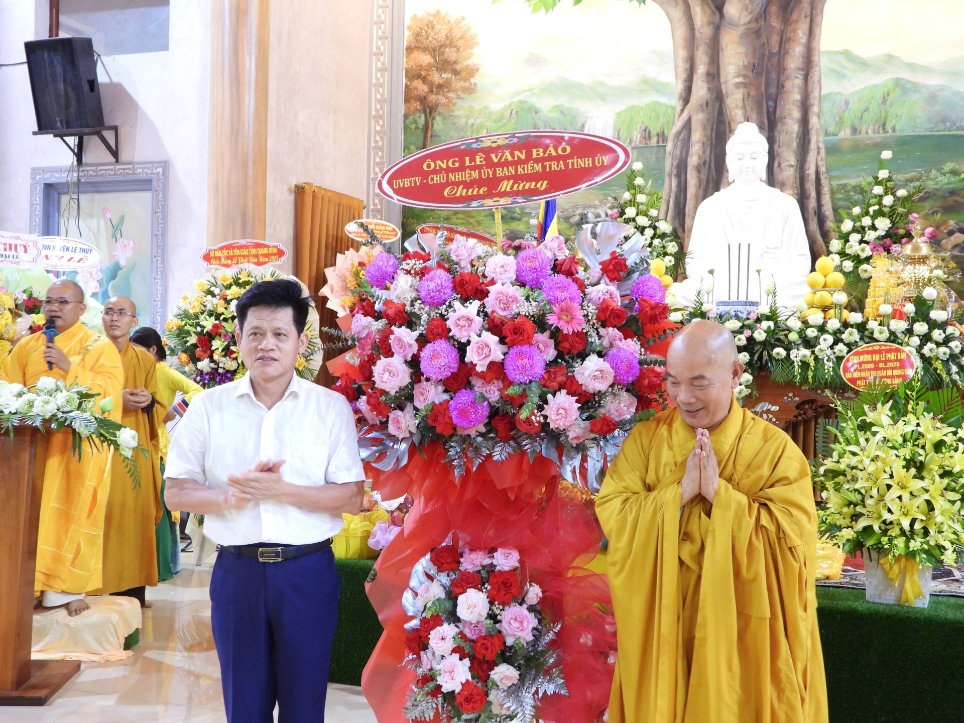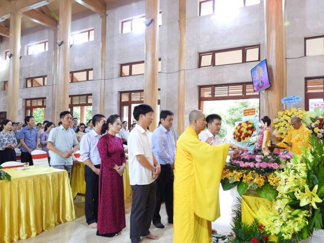 Trong không gian linh thiêng của buổi lễ, các đồng chí lãnh đạo tỉnh, huyện và đại diện các cơ quan, ban ngành cùng đại diện GHPGVN các huyện trên địa bàn tỉnh đã tặng những lẵng hoa và giỏ quả tươi thắm, thể hiện sự trân trọng đối với giá trị tinh thần và văn hóa mà Phật giáo mang lại cho đời sống xã hội. Sự hiện diện và chúc mừng của lãnh đạo các cấp không chỉ khẳng định vai trò đồng hành của chính quyền trong các hoạt động tôn giáo, mà còn góp phần củng cố khối đại đoàn kết toàn dân tộc trên nền tảng đạo lý, văn hóa và niềm tin nhân văn.