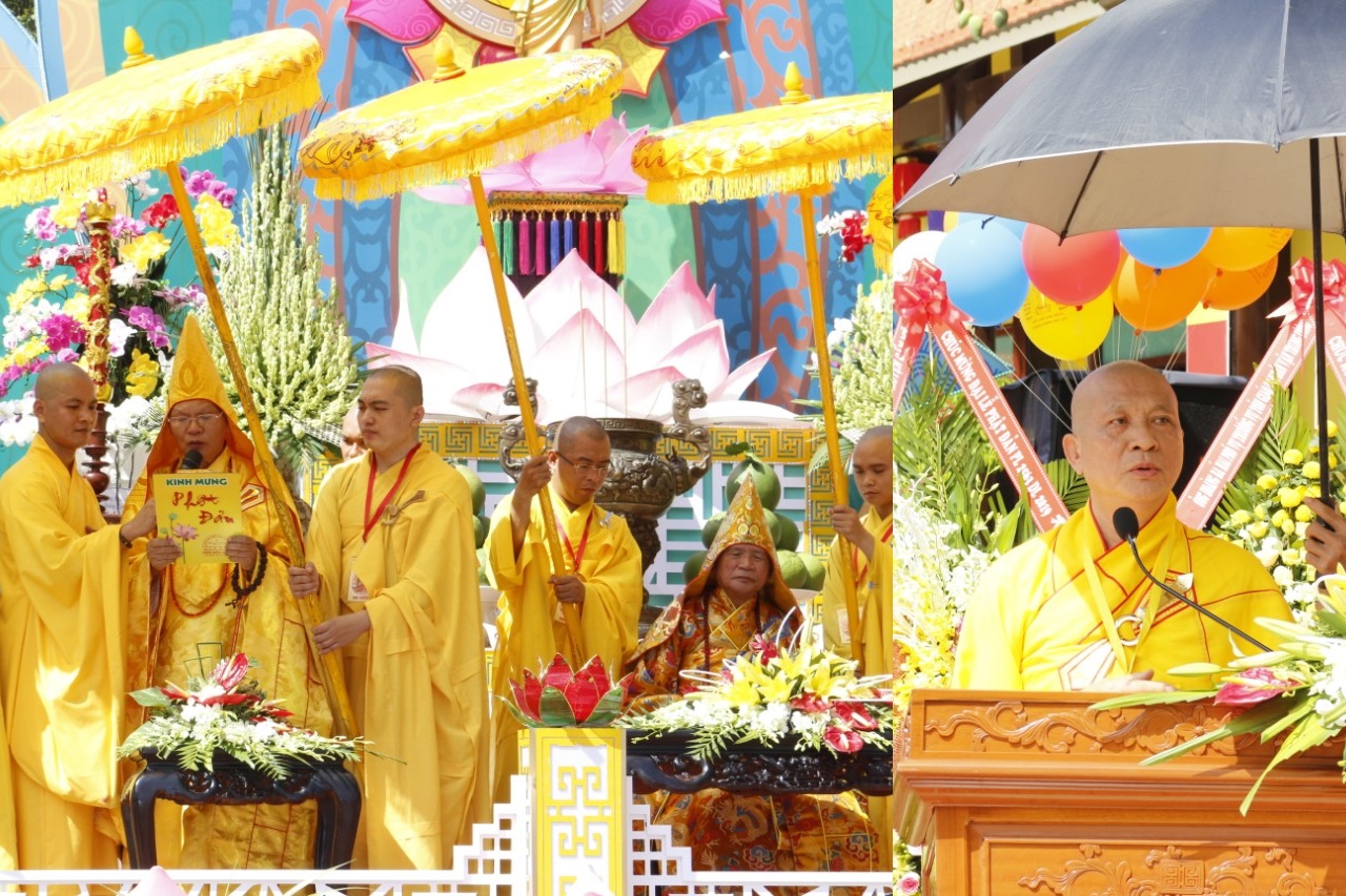 Sau nghi thức cử chuông trống bát nhã rước lễ Đản sanh, không gian trở nên trang nghiêm, thanh tịnh Hoà Thượng Chứng Minh tuyên đọc thông điệp Phật đản Phật lịch 2563 của Đức pháp chủ Giáo hội Phật giáo Việt Nam.