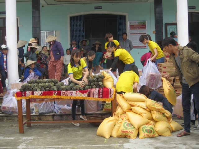 Mỗi phần quà gồm: 10kg gạo, 1 thùng mì gói, 1 chai dầu ăn (1lít), nước tương và 2 đòn bánh tét. Trị giá hơn 80 triệu đồng.