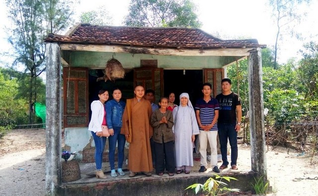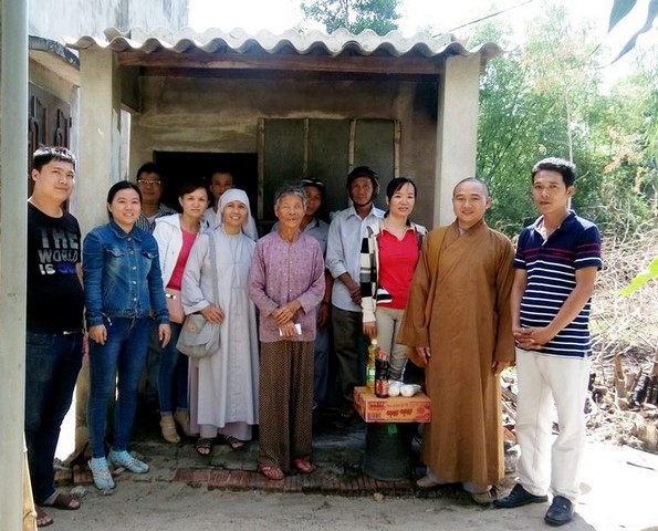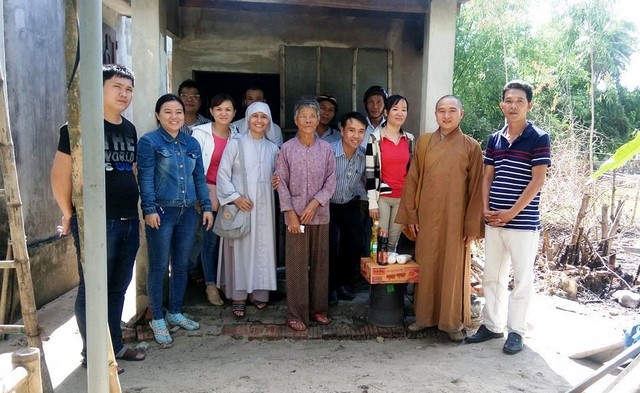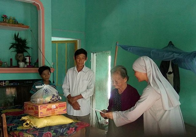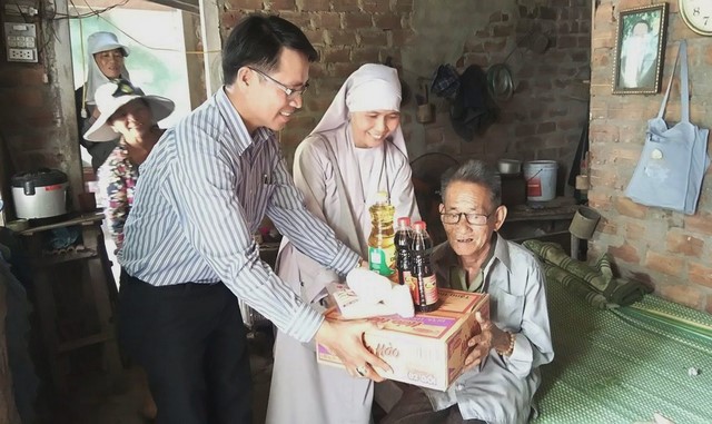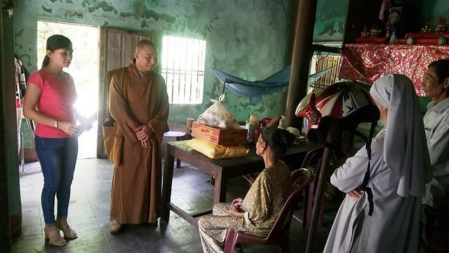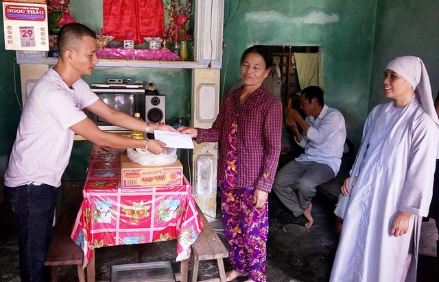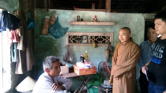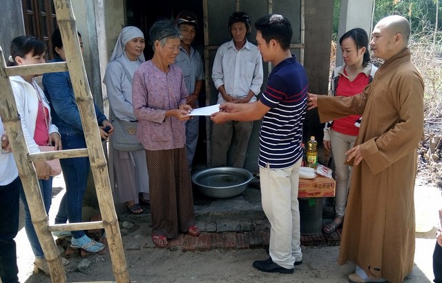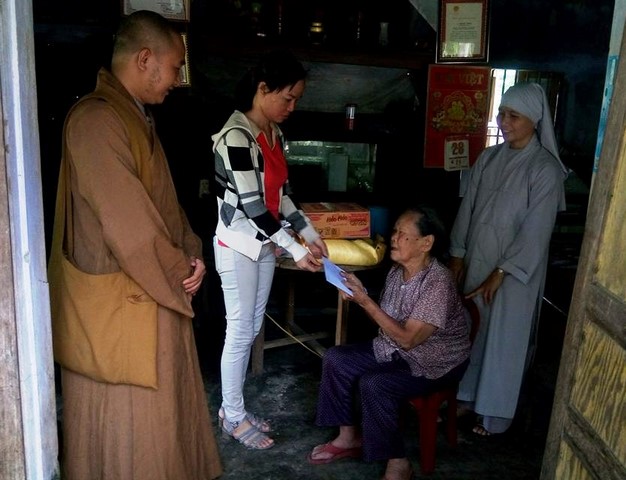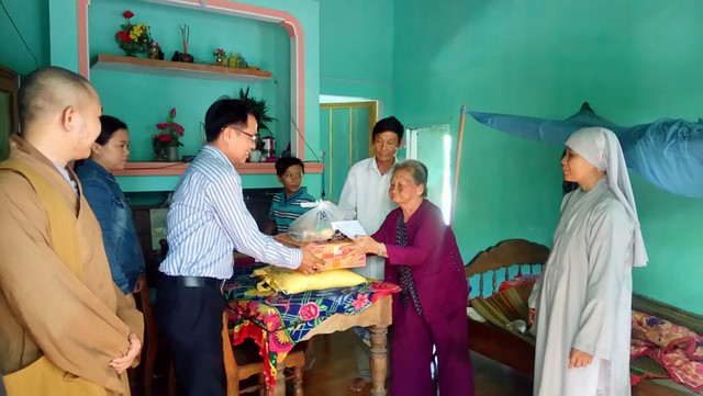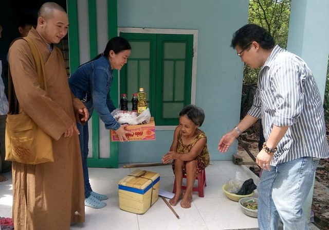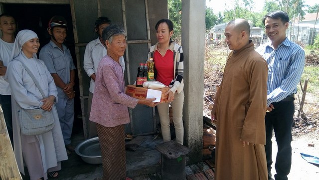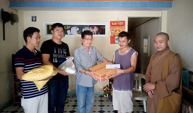 Những phần quà (bao gồm gạo, mì gói, các yếu phẩm và tiền mặt) cho những hộ gia đình có hoàn cảnh đặc biệt khó khăn tại thôn An Phú, xã Tam Phú, TP.Tam Kỳ, do ĐĐ.Thích Viên Hải, trụ trì chùa Linh Bửu làm trưởng đoàn.