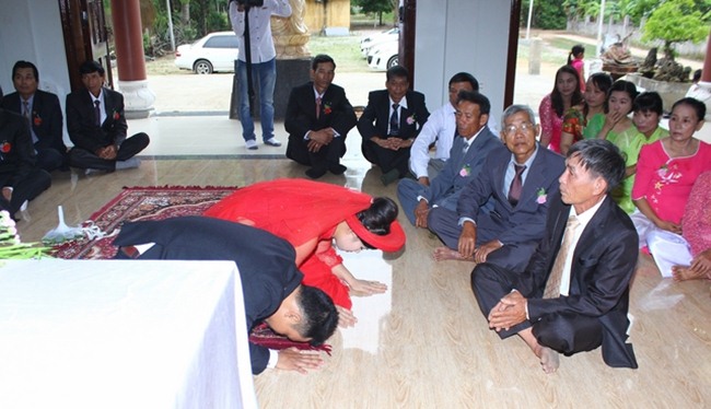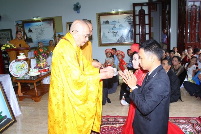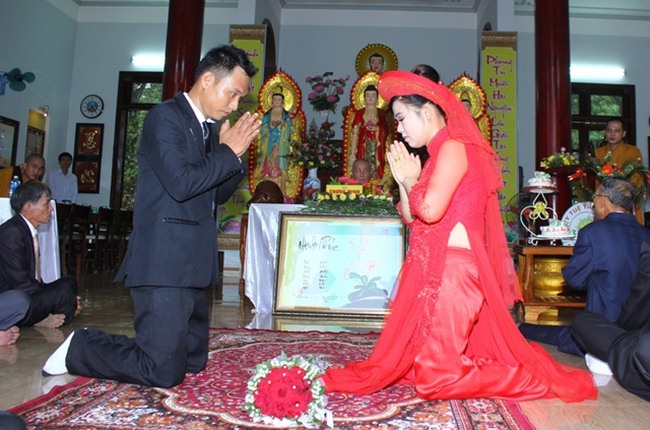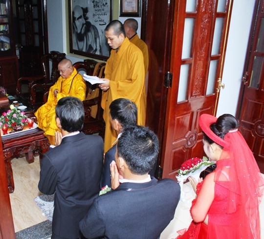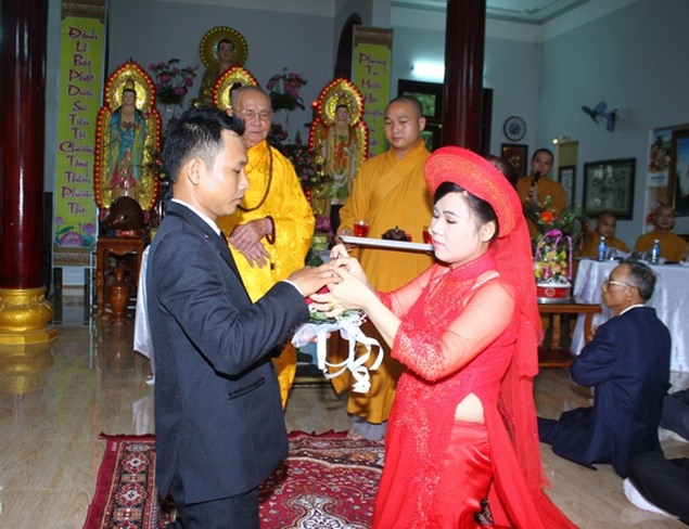 Trước Phật đài trang nghiêm tôn kính và sự chứng minh chú nguyện của chư tôn đức, cô dâu và chú rễ đã dâng lời phát nguyện thành tâm của mình thề trọn đời yêu nhau, suốt đời thâm tín chư Phật và phụng sự tam bảo, luôn luôn tỏ ra xứng đáng là người phật tử chân chánh trên con đường hướng thiện và hành thiện…