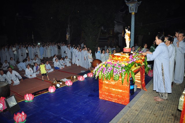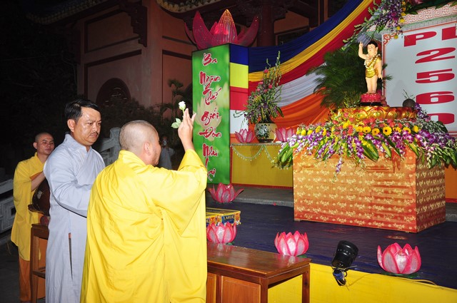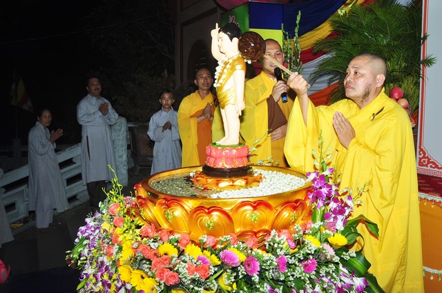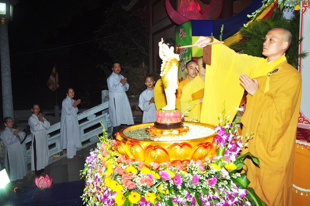 Sau nghi thức niêm hương bạch Phật, ĐĐ.Thích Tịnh Châu đã tiến hành nghi thức tắm Phật diễn ra một cách trang nghiêm trong bối cảnh thanh tịnh. Cả hội chúng đồng thanh trì tụng kệ tắm Phật và múc từng gáo nước tắm lên thân tượng Phật đản sanh.