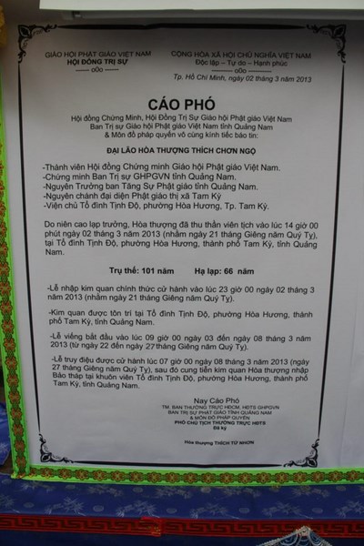 Giờ đây, trong giây phút ngàn thu vĩnh biệt, trước linh đài khói hương quyện tỏa, chúng tôi thay mặt Hội đồng Chứng minh, Hội đồng Trị sự Giáo hội Phật giáo Việt Nam, Ban Trị sự Giáo hội Phật giáo Việt Nam tỉnh Quảng Nam là những pháp lữ đồng sự, đồng hành trong Chánh pháp, xin đốt nén tâm hương cúng dường giác linh Hòa thượng.