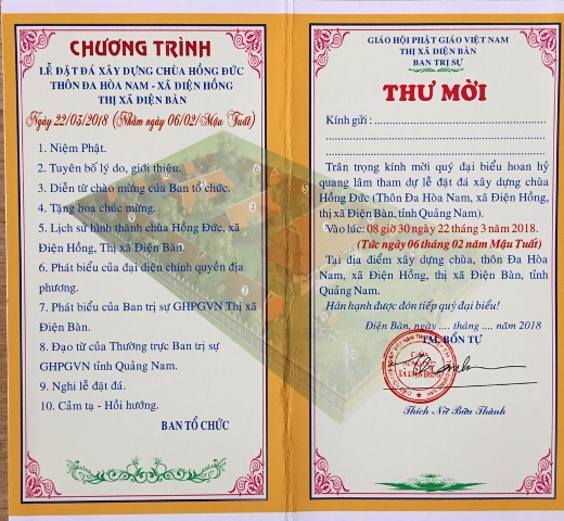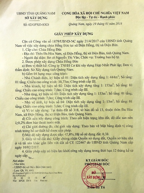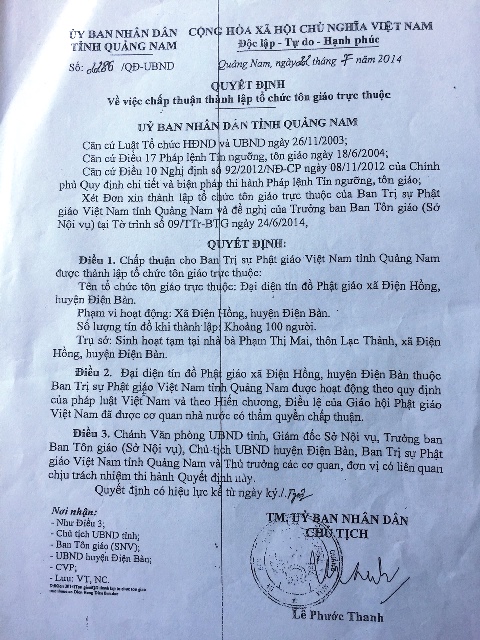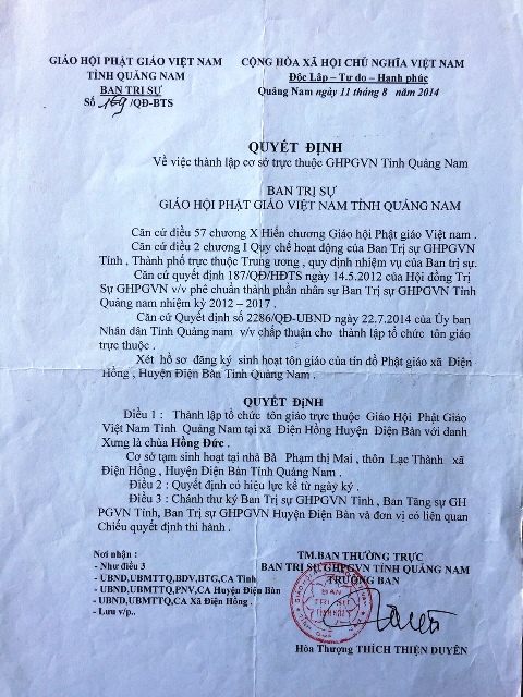 Thấu hiểu nỗi lòng của người dân nơi đây, trong nhiệm kỳ IV (2012 – 2017) Trưởng lão Hòa thượng Thích Thiện Duyên, nguyên Trưởng Ban Trị Sự GHPGVN tỉnh Quảng Nam đã một mặt động viên bà con Phật tử tín tâm tin tưởng vào sự gia hộ của Tam Bảo, một mặt Hòa thượng đã tìm mọi cách tác động đến Ban Tôn Giáo và UBND tỉnh. Kết quả thật đáng khích lệ, ngày 22/07/2014 UBND tỉnh đã ký quyết định số 2286/QĐ-UBND chấp thuận cho Giáo hội thành lập tổ chức Tôn giáo trực thuộc GHPGVN tỉnh Quảng Nam và tiếp theo quyết định này ngày 11/08/2014 Hòa thượng nguyên Trưởng Ban Trị Sự PG tỉnh đã ký quyết định số 169/QĐ-BTS cho phép thành lập Chùa Hồng Đức tọa lạc tại xã Điện Hồng, thị xã Điện Bàn.