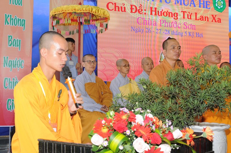 Sau lễ khai mạc, toàn thể khóa sinh được hân hạnh đón tiếp lời Pháp ngọt ngào từ ĐĐ. Thích Chánh Huệ – UV BTS PG tỉnh, Phó hiệu Trưởng trường Phật học Quảng Nam với đề tài “Hương từ lan xa”. Thời pháp thoại đến với các bạn trẻ qua bài “Kinh thương yêu” (Thiền môn nhật tụng – Thích Nhất Hạnh), đi sâu giảng giải bài kinh này, Đại đức giảng sư đã trao truyền giá trị của lòng thương yêu và sự hiểu biết đến với các khóa sinh. Nhắn nhủ các khóa sinh về sự thẳng thắn, kính nhường, bao dung và thông điệp về bảo vệ sự sống, bảo vệ môi trường. Đó chính là thể hiện lòng từ đích thực.