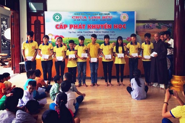 100 học sinh tại thôn Thạch Tân và TTNPT chùa Linh Bửu là học sinh giỏi, có thành tích xuất sắc trong năm học qua được cấp học bổng (mỗi phần trị giá 300 nghìn đồng tiền mặt).