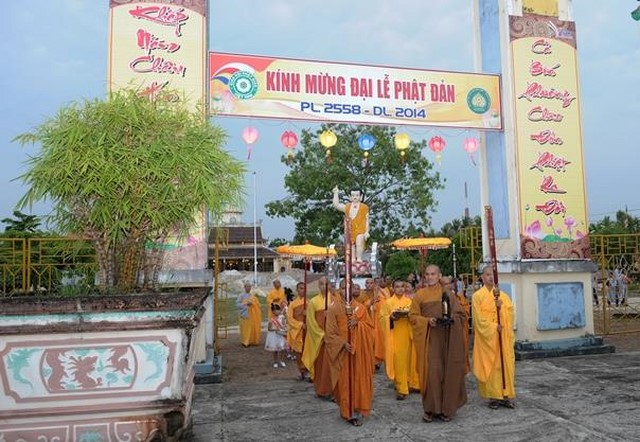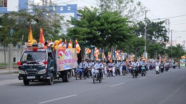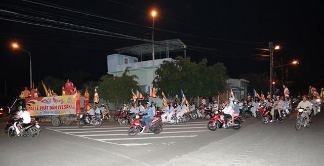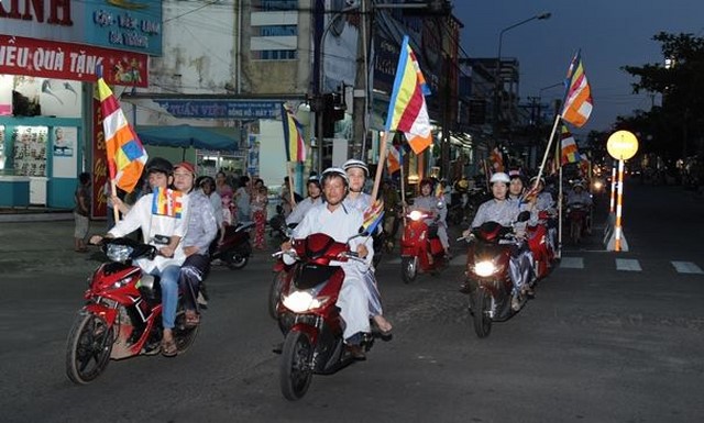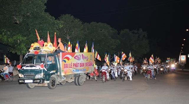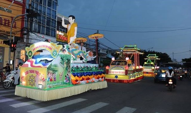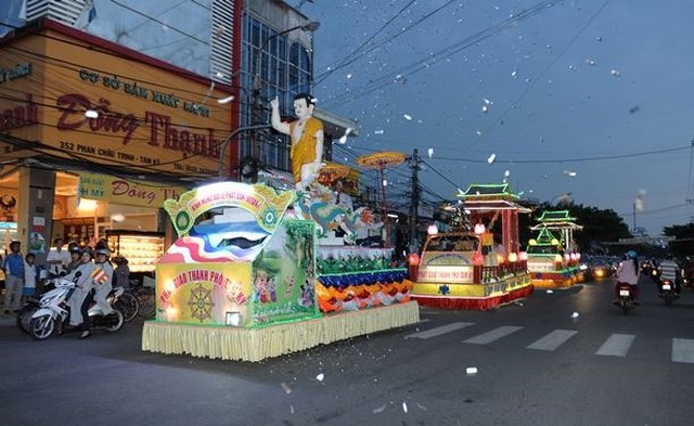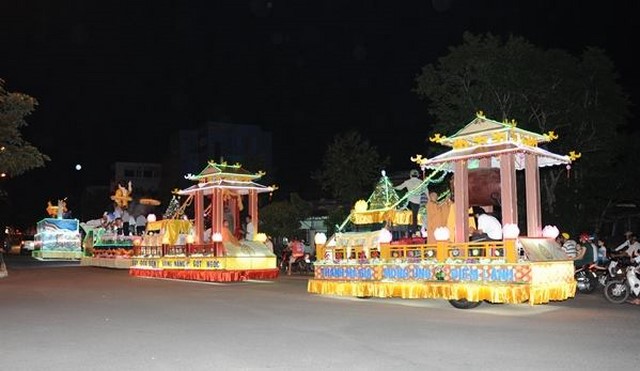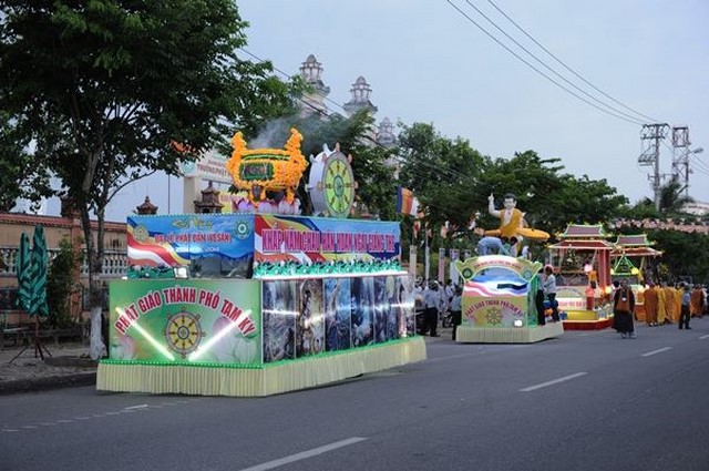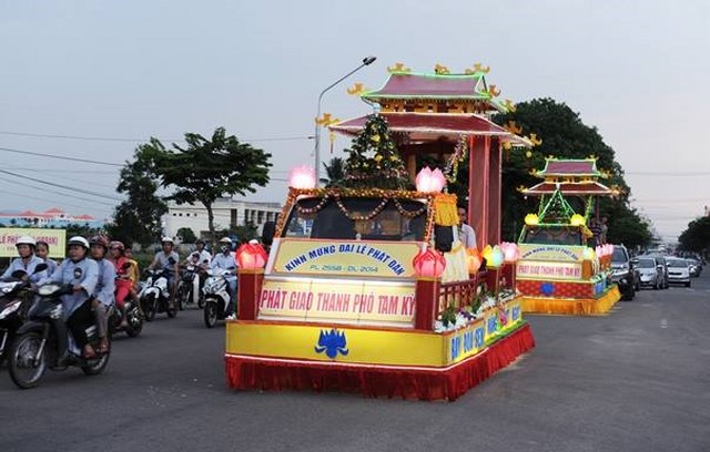 Năm nay GHPGVN đăng cai tổ chức Đại lễ Phật đản Vesak (PL: 2558 – DL: 2014) tại trung tâm cố đô Hoa Lư, Khu du lịch Trường An, Tại chùa Bái Đính tỉnh Ninh Bình. Để thể hiện niềm tôn kính của người con Phật, Phật Giáo thành phố Tam Kỳ đã Phát tâm thiết trí bốn chiếc xe hoa gồm xe Đảnh Hương đi đầu với ý nghĩa dâng cúng hương trầm lên đức Từ Phụ. Tiếp đến là xe rước Phật với hình ảnh đôi rồng đứng chầu, màu cờ Phật giáo tung bay tượng trưng cho tinh thần từ bi. Đi phía sau xe rước Tôn tượng là hai xe Chuông và Trống, nhịp chuông trống bát nhã liên tục được cữ lên, âm vang lan toả khắp mọi con đường, ngõ ngách thành phố Tam kỳ về đêm, tạo một không khí sôi nỗi vui tươi đến với người dân Tam Kỳ hiền hoà, yêu chuộng tinh thần từ bi.