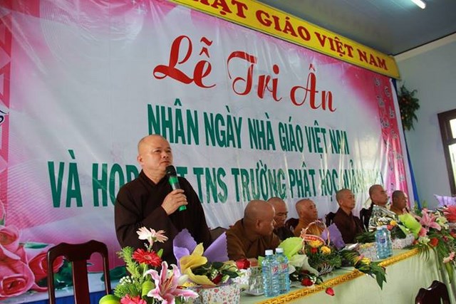 Bắt đầu buổi Lễ Tri  Ân Đại Đức Thích Tịnh Đức đại diện cho toàn thể Tăng Ni sinh các khoá đã có lời chào,  chúc mừng gửi đến Chư Tôn Đức Thường trưc BTS, Quý Thầy trong Ban Giám hiệu và các thầy cô giáo. Tiếp đến Đại Đức Thích Đồng Bình đã nói lên những cảm xúc sâu lắng nhất nhằm tri ân những công lao to lớn mà quý Ngài đã dày công đào tạo, giảng dạy cho TNS trưởng thành. Mặc dầu chúng con ngày hôm nay đều đã trưởng thành, nhưng đối với quý thầy cô và trường Phật học, chúng con mãi là những người học trò nhỏ bé và yêu mến của quý Ngài.