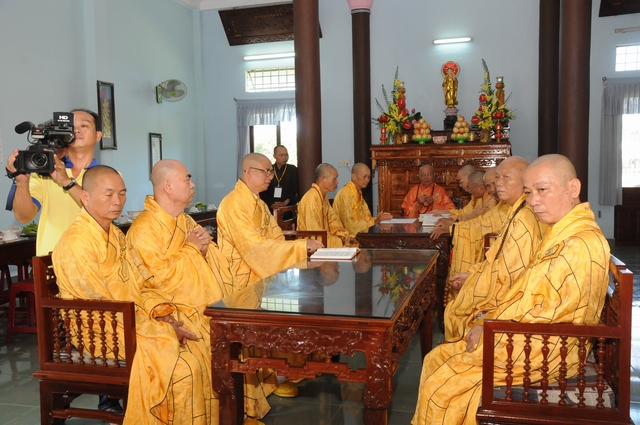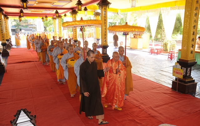 Tôn đức Giới sư quang lâm giới trường, niêm hương bạch Phật chính thức cử hành lễ Tấn đàn Tỳ kheo. Theo nghi thức, cứ mỗi đàn có 3 vị lần lượt tiến vào khu vực truyền giới và đảnh lễ chư tôn giáo phẩm Hội đồng Thập sư Tăng gồm: Trưởng lão HT.Thích Thiện Duyên đương vi Hòa thượng đàn đầu, HT.Thích Hạnh Niệm đương vi Yết-ma A-xà-lê, HT.Thích Thiện Thành đương vi Giáo thọ A-xà-lê 1; TT.Thích Hạnh Hoa đương vi Giáo thọ A-xà-lê 2 và chư tôn giáo phẩm trong hàng Thất chứng. Khi chư Tôn đức Giới sư an vị Pháp tòa, nhị vị dẫn thỉnh đã hướng dẫn Giới tử đảnh lễ Hòa thượng Đàn đầu và chư vị Giới sư để cầu thọ Cụ túc giới. Sau khi được Hội đồng Thập sư hoan hỷ, các giới tử thối ban để chư Giới sư Yết-ma cử hành truyền thọ Tỳ kheo giới.