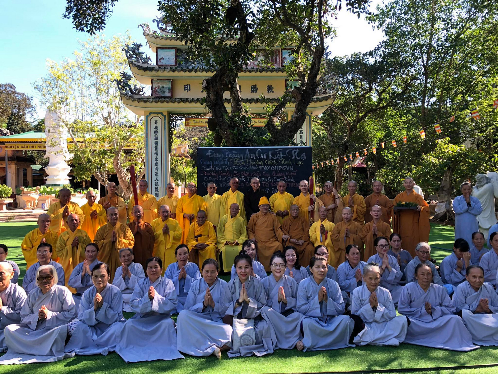 HT.Thích Hạnh Ngộ – Trưởng Ban Quản trị Tổ đình Thiên Ấn kiêm Trưởng Ban tổ chức Trường hạ cùng chư Tôn Hoà thượng trong Ban chức sự, và hơn 40 hành giả an cư cung kính tiếp phái đoàn.