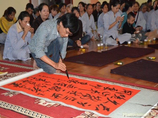Trong khi Đại Đức Thích Trúc Thái Minh chia sẻ Pháp thoại thì các nghệ nhân thư pháp thuộc viện nghiên cứu Hán Nôm đã trực tiếp viết 5 bài thơ bằng tiếng Hán nổi tiếng của tổ Huyền Quang trên chất liệu giấy lụa đỏ.