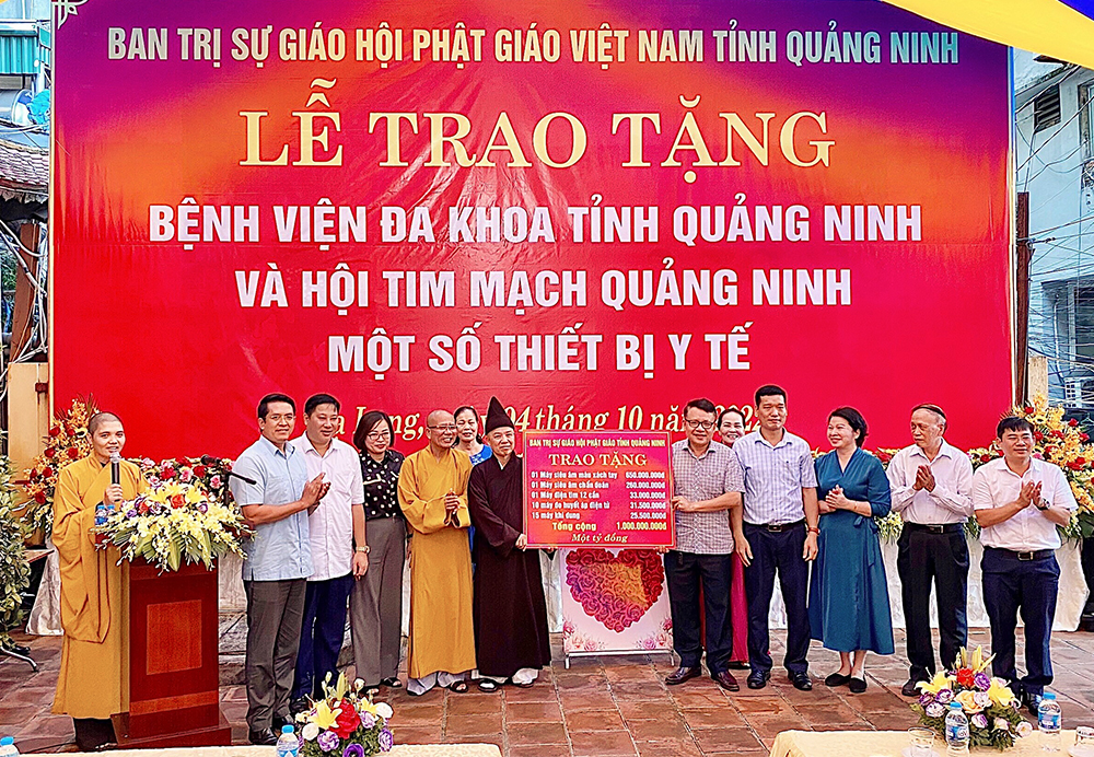 Chiều ngày 04/10/2022, tại Chùa Long Tiên – Phường Bạch Đằng, thành phố Hạ Long, Quảng Ninh, Ban Trị sự Giáo hội Phật giáo Việt Nam (GHPGVN) tỉnh Quảng Ninh đã tổ chức buổi lễ trao tặng trang thiết bị y tế cho Bệnh viện Đa khoa tỉnh và Hội tim mạch Quảng Ninh với tổng số tiền là 01 tỷ đồng.