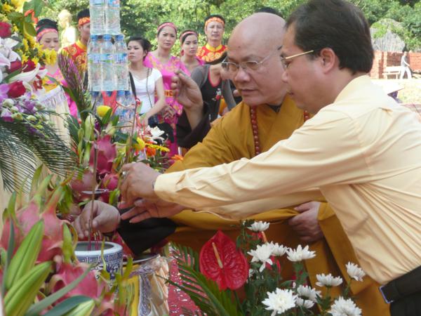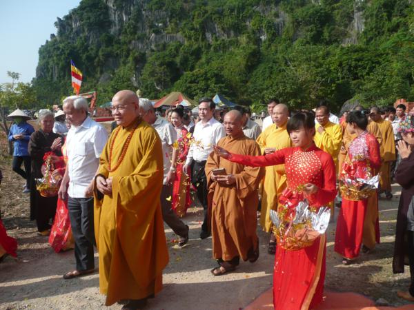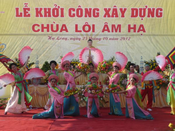 Đầu buổi sáng, một chương trình văn nghệ đặc sắc được trình diễn với sự tham gia của các nghệ sĩ đoàn chèo Quảng Ninh và các Phật tử đã tạo nên không khí tưng bừng, hân hoan trong một không gian lễ hội rực rỡ của cờ phướn, băng rôn biểu ngữ.