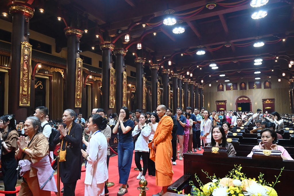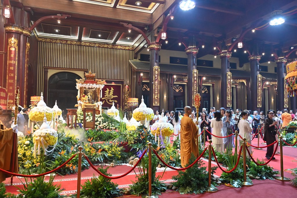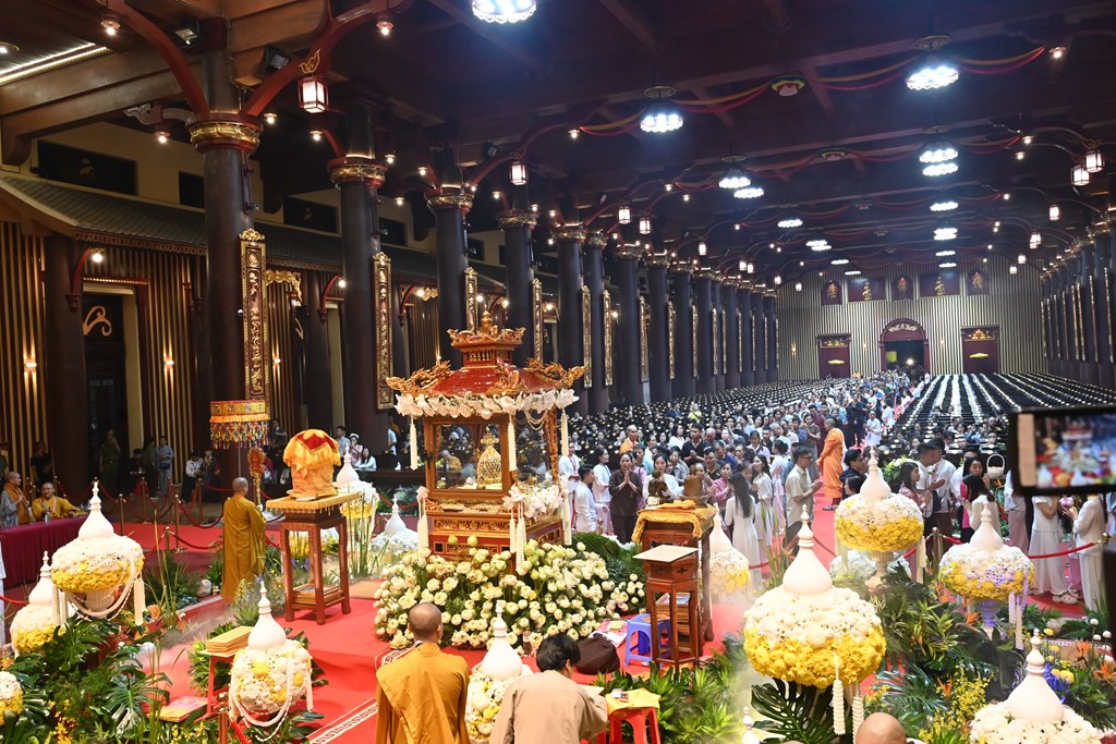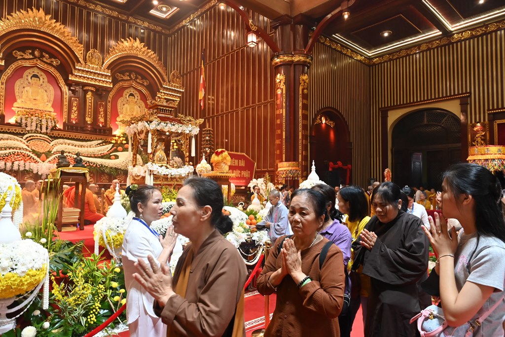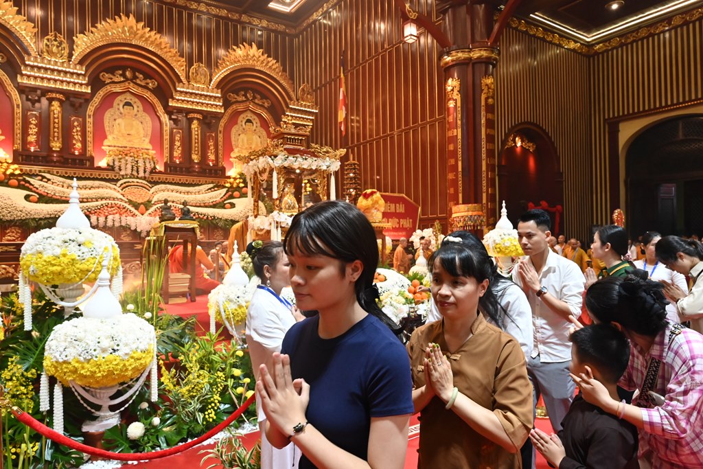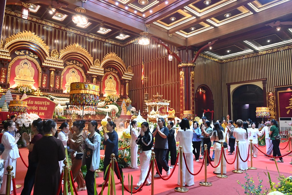 Mặc dù tối muộn nhưng rất nhiều đoàn xe ô tô lối đuôi nhau vân tập về Cung Trúc Lâm Yên Tử, các bãi đỗ xe hầu như đã kín chỗ, bên phía trong Cung Trúc Lâm, các Phật tử lần lượt xếp hàng trong trang nghiêm, chắp tay thành kính niệm danh hiệu Đức Bản Sư Thích Ca Mâu Ni Phật, nhiễu qua tháp tôn trí Xá lợi Đức Phật, cầu nguyện cho Thế giới hòa bình, chúng sinh an lac, gia đạo được bình an.