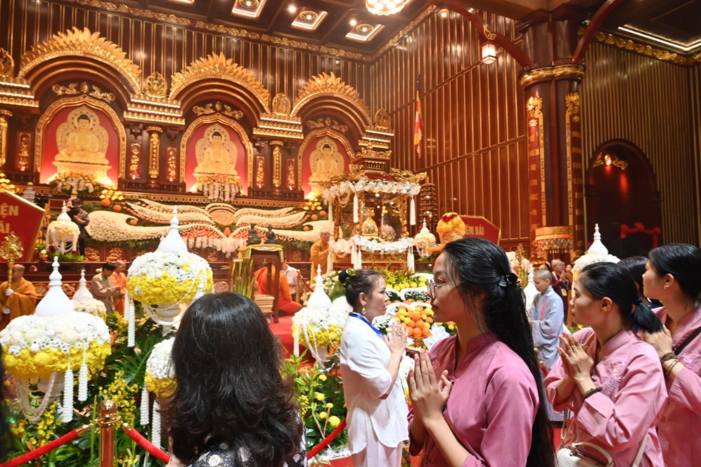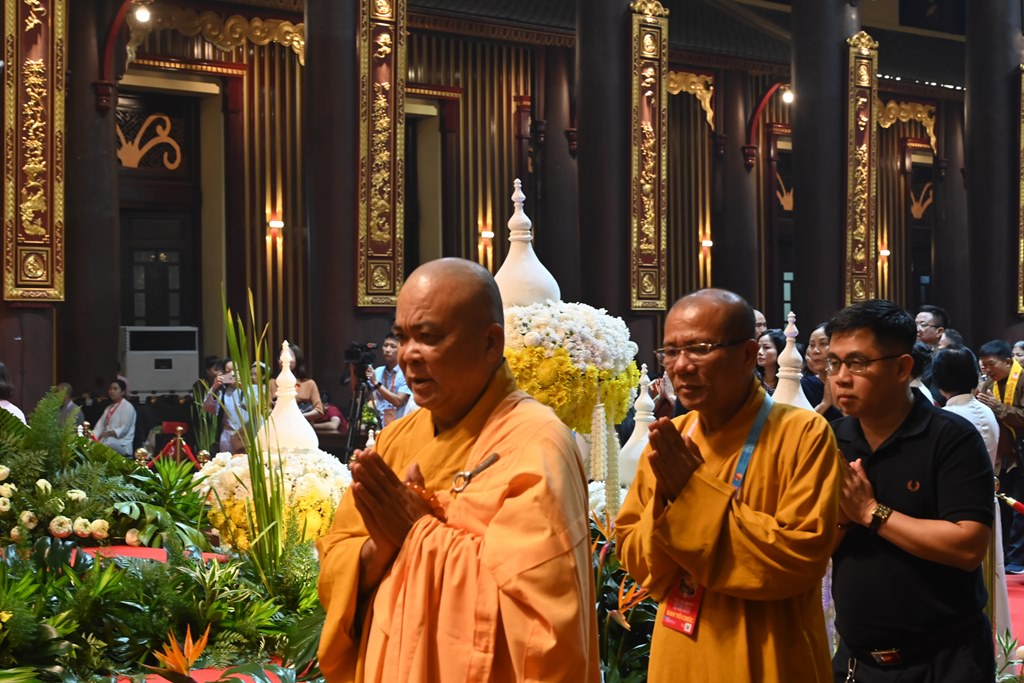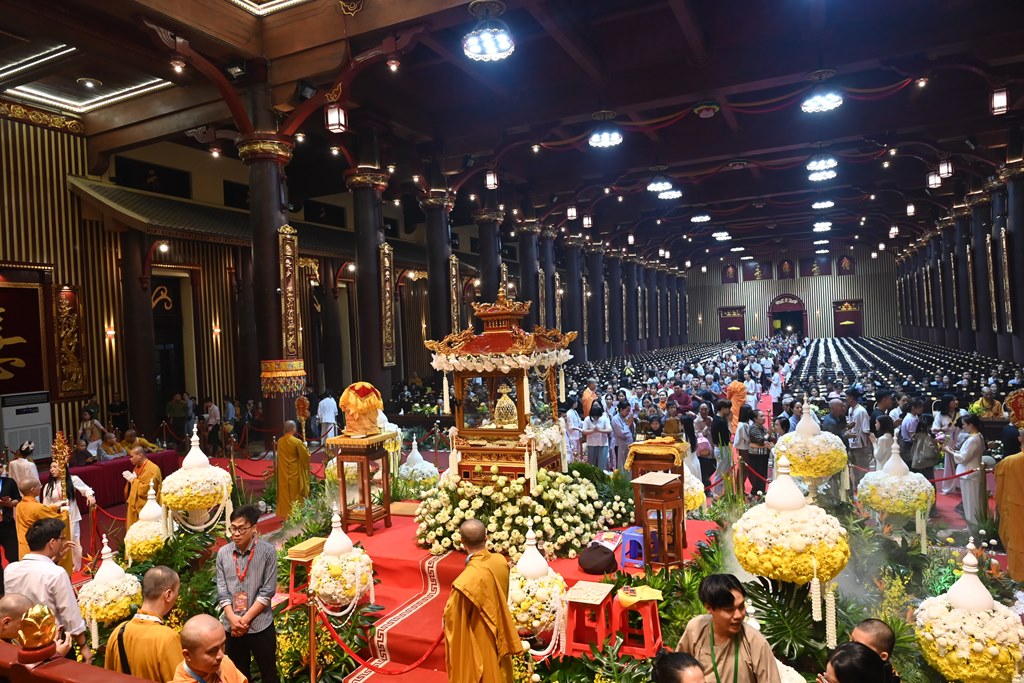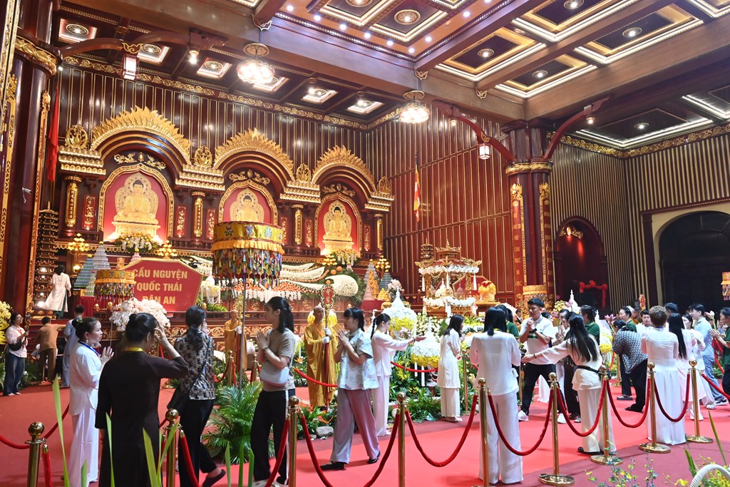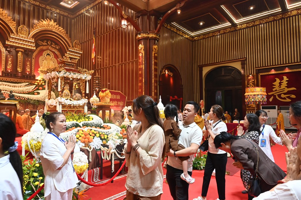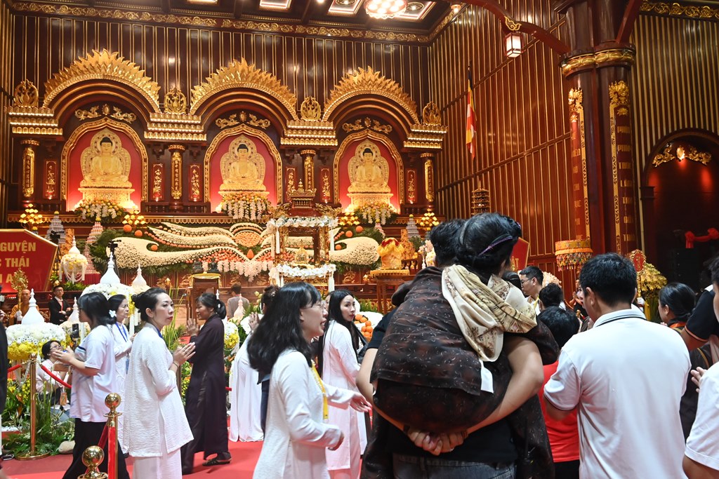 Mặc dù tối muộn nhưng rất nhiều đoàn xe ô tô lối đuôi nhau vân tập về Cung Trúc Lâm Yên Tử, các bãi đỗ xe hầu như đã kín chỗ, bên phía trong Cung Trúc Lâm, các Phật tử lần lượt xếp hàng trong trang nghiêm, chắp tay thành kính niệm danh hiệu Đức Bản Sư Thích Ca Mâu Ni Phật, nhiễu qua tháp tôn trí Xá lợi Đức Phật, cầu nguyện cho Thế giới hòa bình, chúng sinh an lac, gia đạo được bình an.