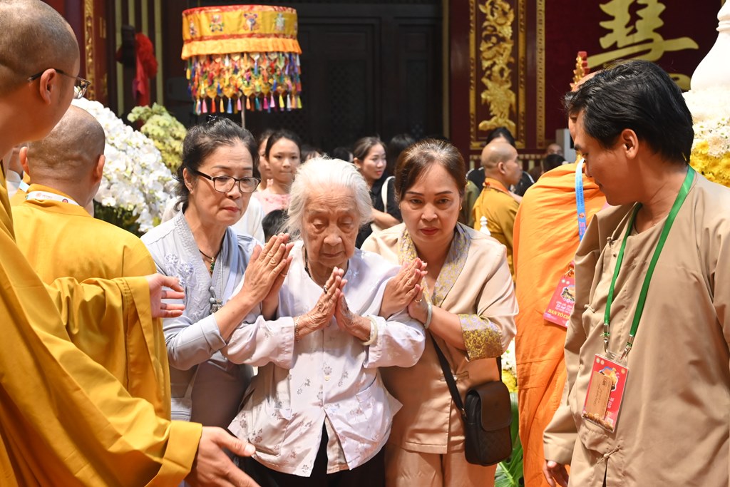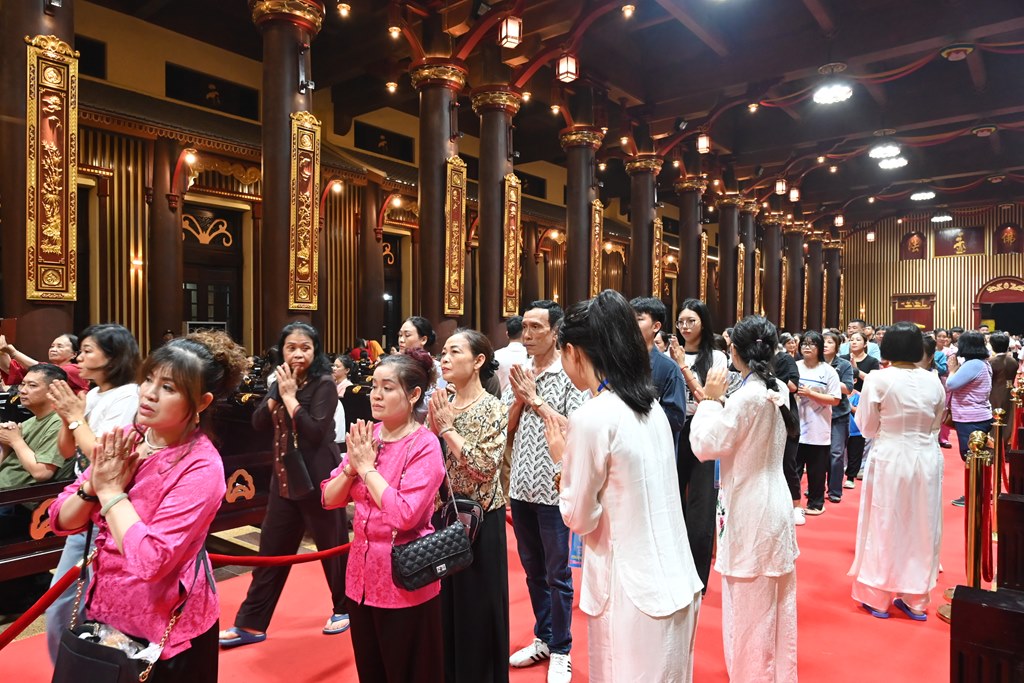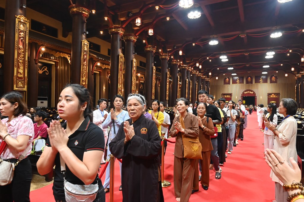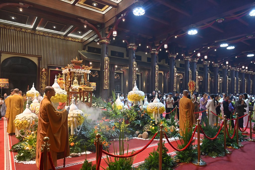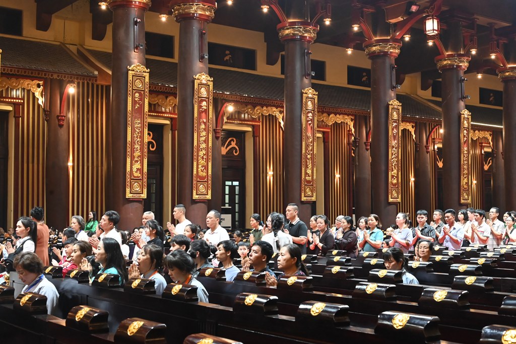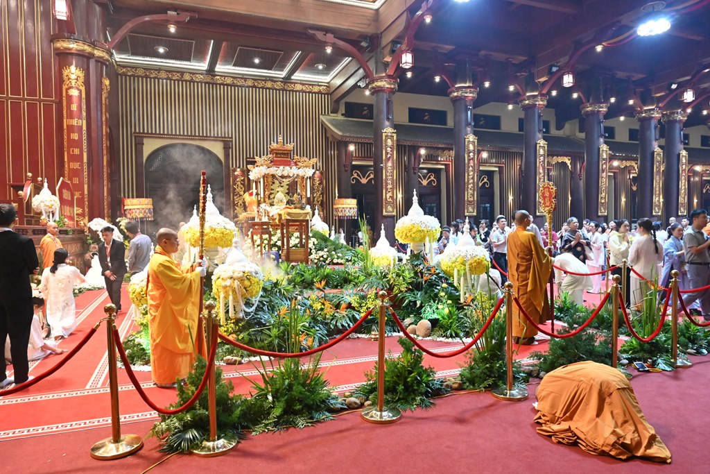 Mặc dù tối muộn nhưng rất nhiều đoàn xe ô tô lối đuôi nhau vân tập về Cung Trúc Lâm Yên Tử, các bãi đỗ xe hầu như đã kín chỗ, bên phía trong Cung Trúc Lâm, các Phật tử lần lượt xếp hàng trong trang nghiêm, chắp tay thành kính niệm danh hiệu Đức Bản Sư Thích Ca Mâu Ni Phật, nhiễu qua tháp tôn trí Xá lợi Đức Phật, cầu nguyện cho Thế giới hòa bình, chúng sinh an lac, gia đạo được bình an.