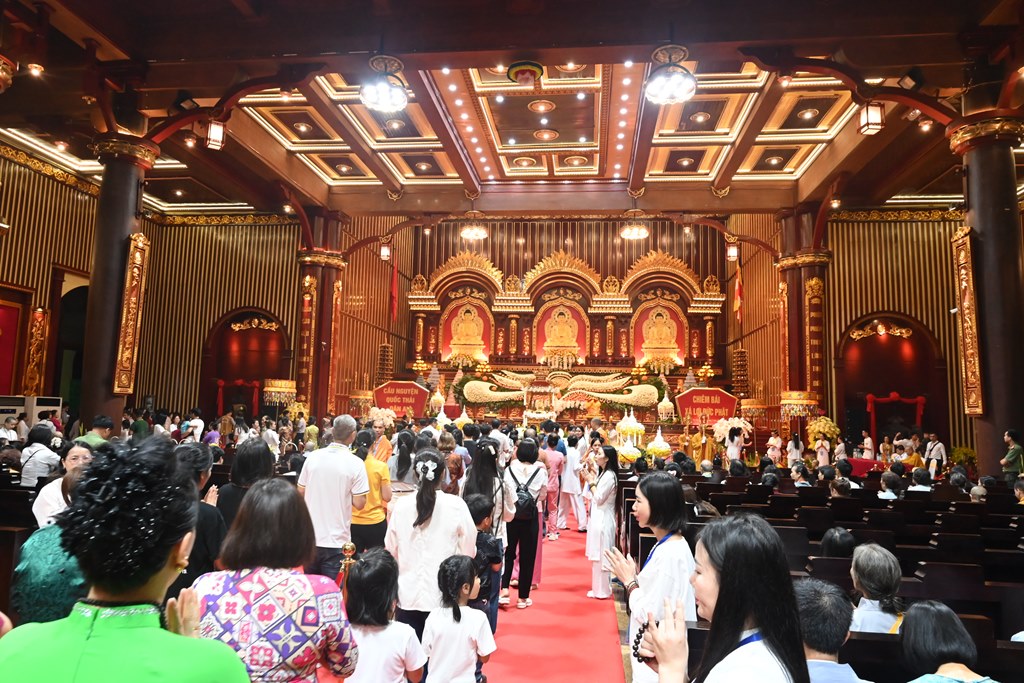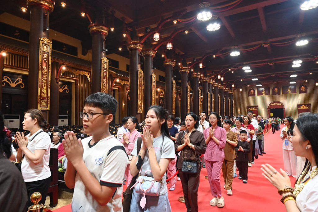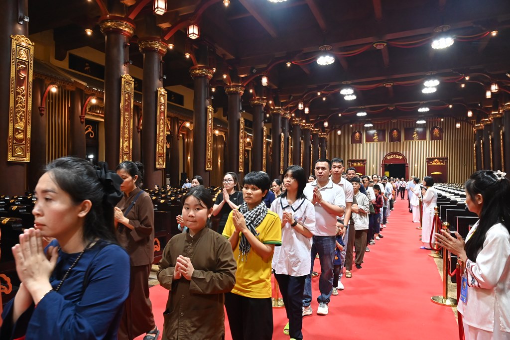 Du khách thập phương và quý Phật tử chắp tay thành kính xếp hàng vào chiêm bái Xá lợi Đức Phật tại Cung Trúc Lâm Yên Tử