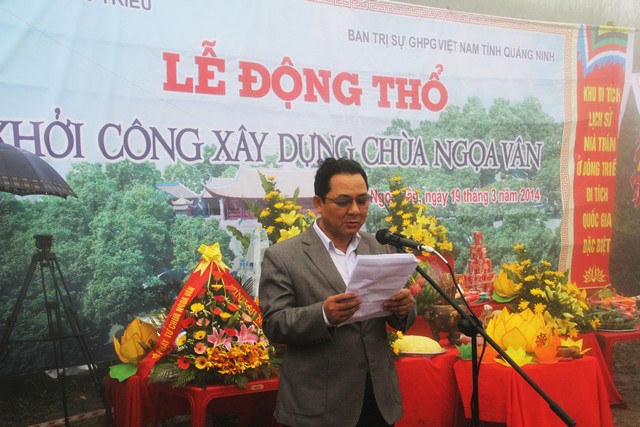 Thay mặt lãnh đạo huyện ông Vũ Văn Học – Chủ tịch huyện Đông Triều gửi lời cảm ơn BTS GHPGVN tỉnh Quảng Ninh cùng với các sở, ban ngành của tỉnh đã tích cực phối hợp với huyện Đông Triều trong suốt quá trình triển khai công tác chuẩn bị đầu tư, phát tâm công đức và tổ chức khởi công xây dựng chùa Ngọa Vân và các điểm di tích trong khu di tích lịch sử nhà Trần tại Đông Triều.