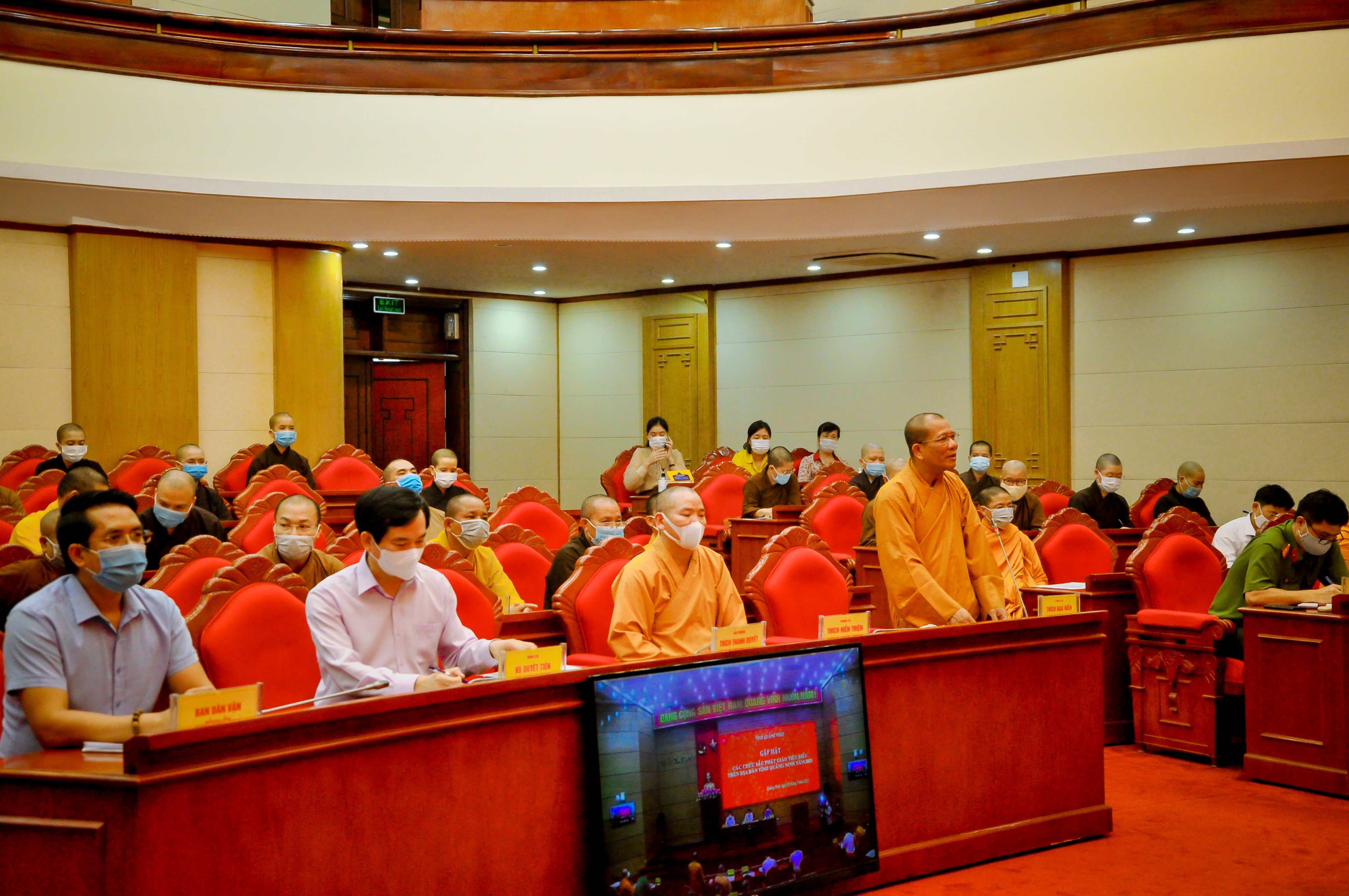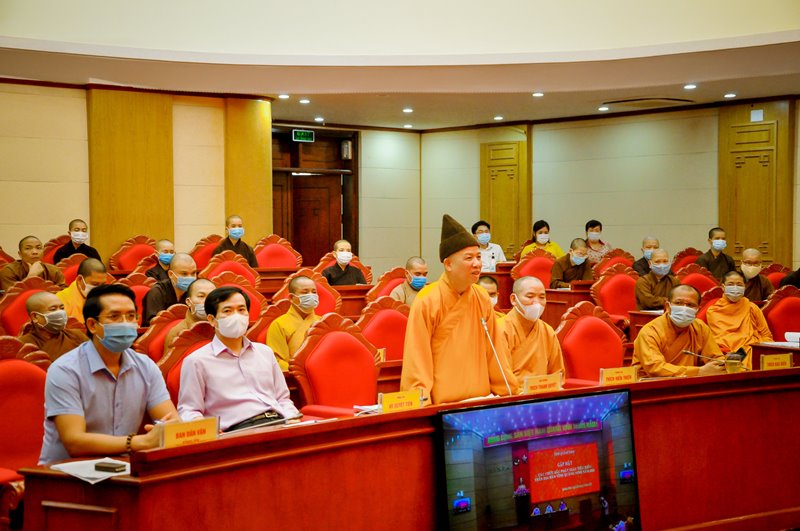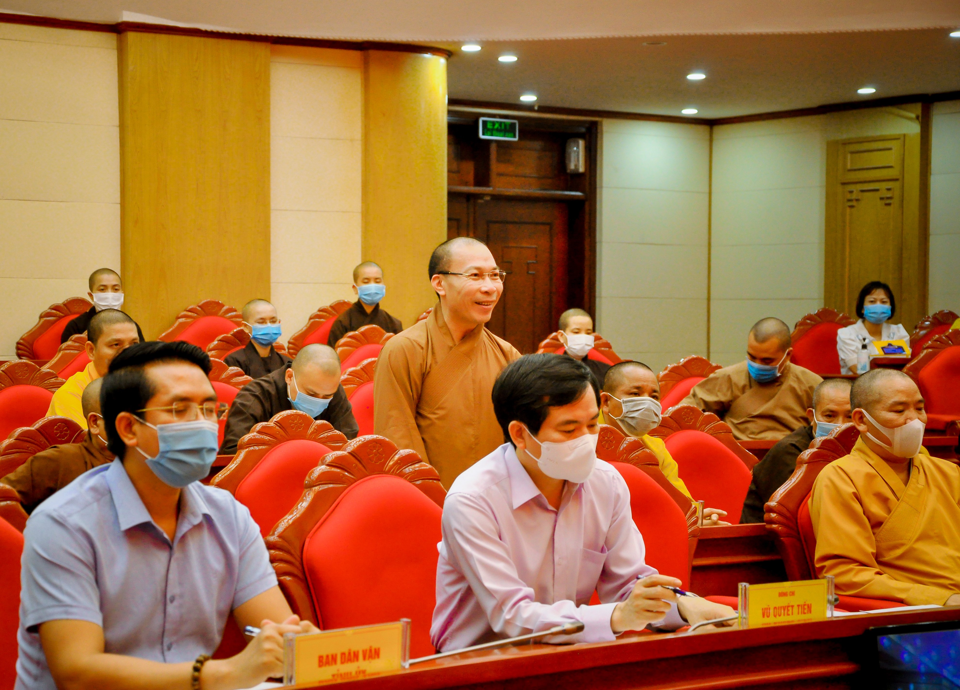 Ông Nguyễn Quyết Tiến – Ủy viên Ban Thường vụ, Trưởng Ban Tổ chức tỉnh ủy, Giám đốc Sở Nội vụ tỉnh Quảng Ninh đã báo cáo báo sơ lược về tình hình hoạt động của các tôn giáo trên địa bàn tỉnh, trong đó có tình hình Phật giáo và những hoạt động, đóng góp nổi bật của Phật giáo tỉnh Quảng Ninh trong thời gian qua. Điển hình như, sau 16 năm thành lập BTS, Phật giáo tỉnh nhà đã có bước phát triển vững chắc, mạnh mẽ và toàn diện. Từ 90.000 Phật tử, 106 tự viện, 77 tăng ni trụ trì 34 tự viện, 14 tăng ni tham gia BTS năm 2005, đến nay đã có 155.000 Phật tử, 150 cơ sở tự viện, trên 600 chức sắc, 230 tổ Phật tử, đạo tràng. Ngoài việc giữ gìn truyền thống sinh hoạt của Phật giáo, đáp ứng nhu cầu tín ngưỡng, tâm linh của người dân, lãnh đạo BTS Phật giáo Quảng Ninh luôn tích cực vận động tín đồ, nhân dân hưởng ứng các phong trào thi đua yêu nước, phát triển kinh tế, tích cực tham gia và hưởng ứng phong trào “Toàn dân bảo vệ an ninh Tổ quốc”, phong trào xây dựng nông thôn mới, các hoạt động từ thiện nhân đạo…