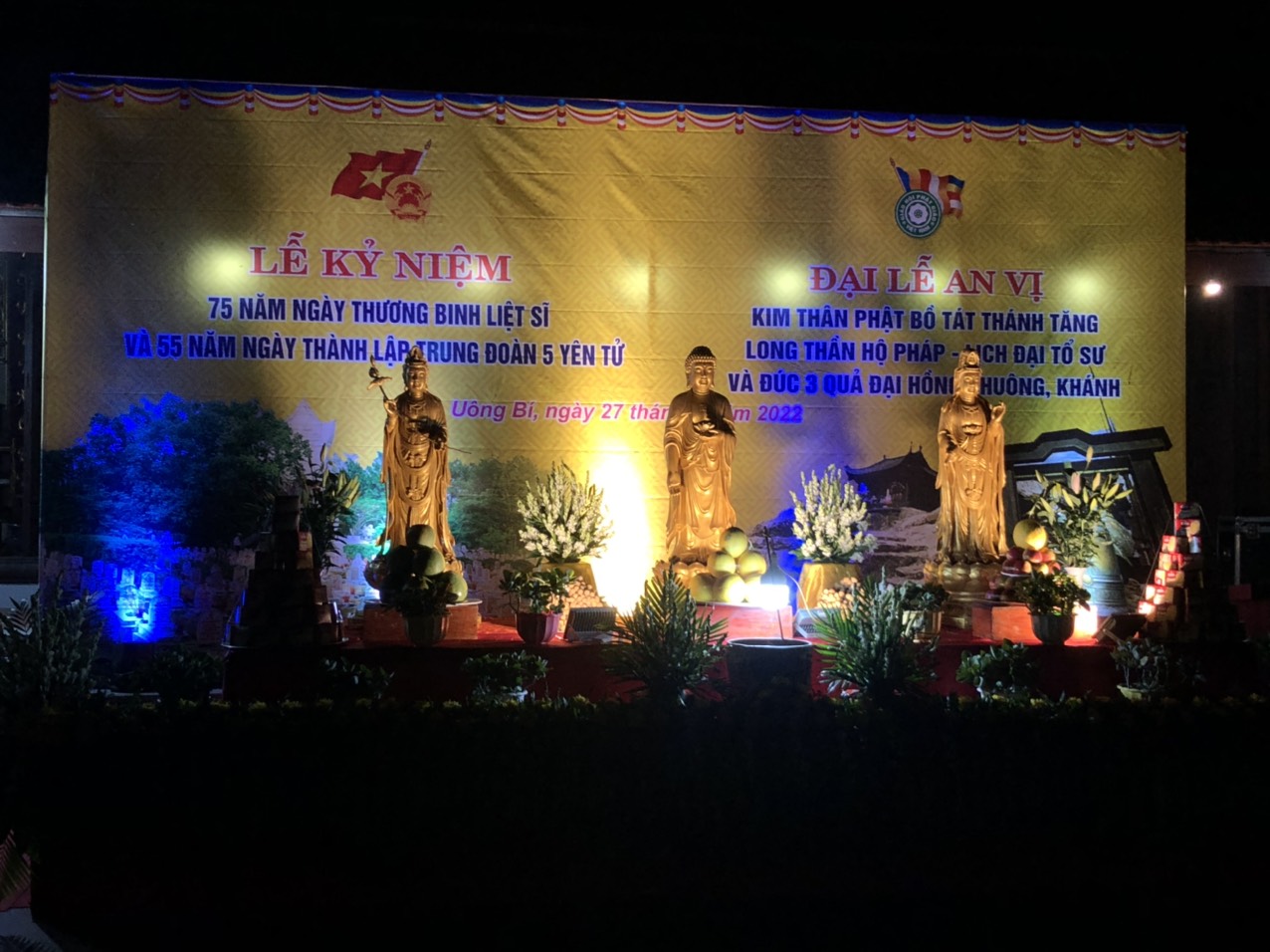 Nhân kỷ niệm 75 năm ngày thương binh liệt sỹ Việt Nam (27/07/1947 – 27/07/2022) và kỷ niệm 55 năm ngày thành lập Trong đoàn 5 Yên Tử, Chư tôn đức Hòa thượng, thượng tọa, đại đức Tăng Ni, các Phật tử và đồng đội cựu chiến binh Trung đoàn 5 – Yên Tử đã tổ chức lễ dâng hương tưởng niệm, cầu siêu anh linh các anh hùng liệt sỹ tại Đền thờ những người con ưu tú của 5 tỉnh Đồng Bằng Sông Hồng đã hy sinh cho Độc lập chủ quyền, mang lại hòa bình cho Đất nước.