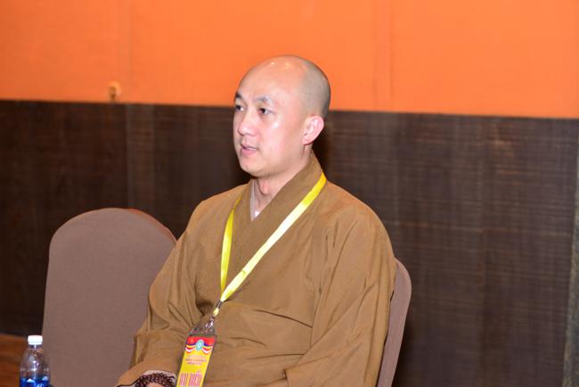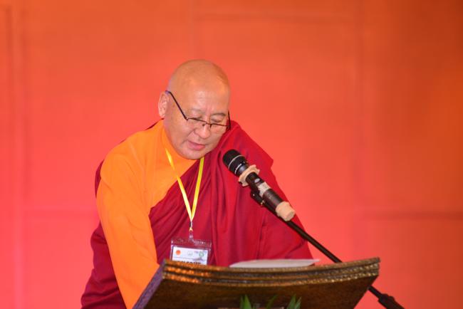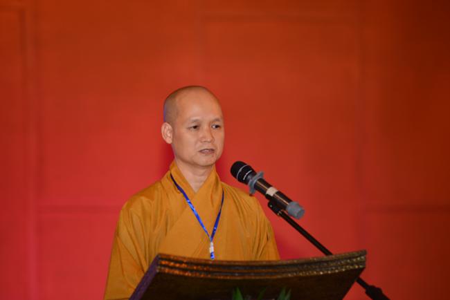 TT. Thích Tâm Đức trình bày bài tham luận bằng tiếng Ạnh trước hội thảo