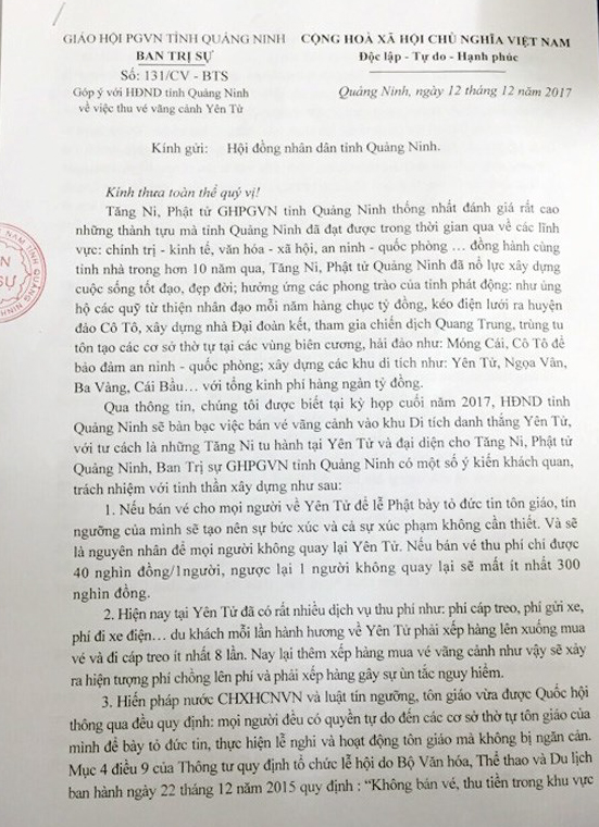 Tại công văn số 131/CV-BTS ngày 12/12/2017 về việc: ” Góp ý với HĐND tỉnh Quảng Ninh về việc thu vé vãng cảnh Yên Tử”, Ban trị sự GHPGVN tỉnh Quảng Ninh cũng bày tỏ quan điểm không đồng tình với việc thu phí vãng cảnh tại khu di tích danh thắng cảnh Yên Tử. Trong công văn có đoạn viết: ” Các tín đồ Phật tử này là những người thường xuyên công đức để góp phần tôn tạo, xây dựng Yên Tử được như ngày hôm nay, thế mà về Yên Tử lễ Phật lại bị thu vé sẽ tạo nên sự bức xúc và cả sự xúc phạm. Đồng thời theo BTS tỉnh Quảng Ninh thì hiện tay tại di tích danh lam thắng cảnh Yên Tử đã thu rất nhiều loại phí khác nhau như: Phí cáp treo, phí xe điện, phí gửi xe vv… Do đó, việc thu phí này sẽ dẫn đến tình trạng phí chồng phí mà đây chính là điều tối kỵ trong cuộc sống và văn hóa ứng xử trong thời kỳ hiện đại hóa.