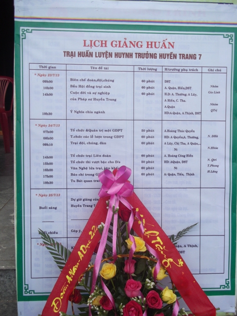 Lễ khai mạc trại tổ chức vào lúc 16 giờ  ngày 23 tháng 7 năm 2013. Có 361 trại sinh tham dự. Trong đó: HT7: 99 t/s, AD22: 131 t/s; LU 40: 131t/s.Sau 5 ngày miệt mài huấn luyện. vào lúc 8 giờ ngày 28 tháng 7 năm 2013, mặc dù trời đổ mưa do ảnh hưởng áp thấp nhiệt đới. Lễ Tổng Kết Liên Trại được Tổ chức trang nghiêm trọng thể tại sân Tổ đình Sắc Tứ Tịnh Quang.