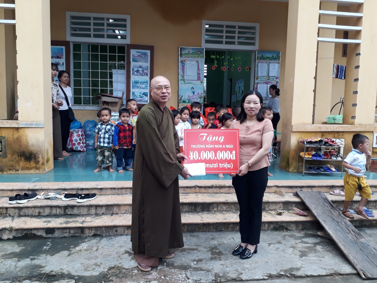 Ngoài ra, đoàn còn trao tặng quà cho các cháu học sinh đang học tập tại trường mầm non A Ngo, trường mầm non A Bung với tổng số tiền là 83 triệu đồng, mỗi trường được tặng 1 tạ gạo, 250 đôi dép và 40 triệu đồng tiền mặt để nhà trường mua sắm thiết bị học tập cho các cháu.