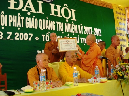 Thay mặt TƯGH, HT.Thích Thiện Nhơn đã tuyên đọc quyết định tuyên dương công đức của HĐTS đối với công tác hoạt động Phật sự của BTS tỉnh Quảng Trị NK III, thừa ủy quyền HT Chủ tịch HĐTS, HT.Thích Thiện Bình đã trao Bằng tuyên dương công đức BTS THPG Quảng Trị.