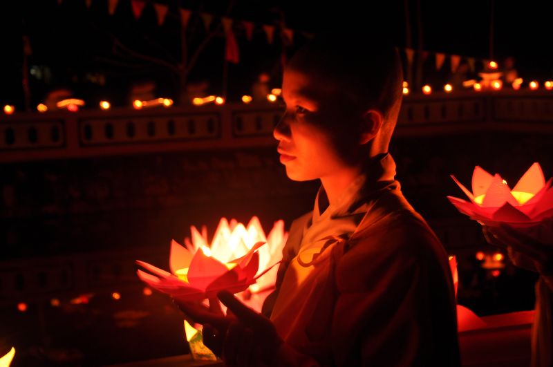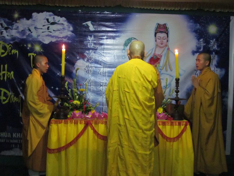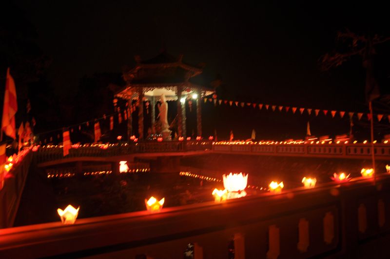 Khi danh hiệu Bồ tát Quán Thế Âm được cất lên, toàn thể đạo tràng trong bước chân an tĩnh đã lần lượt kinh hành về phía đài Quan Âm và xuôi theo con đường làng để năng lực an bình lan tỏa khắp chốn. Cuối buổi lễ, những ngọn đèn được thả xuống hồ Quan Âm để những lời nguyện chân thành, hướng thượng hòa vào hư không và tồn tại trong lòng mỗi người, làm kim chỉ nam trong cuộc sống an bình với niềm tin chánh pháp bất diệt.