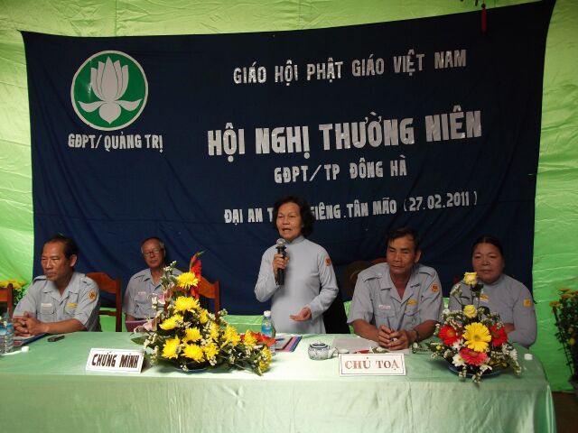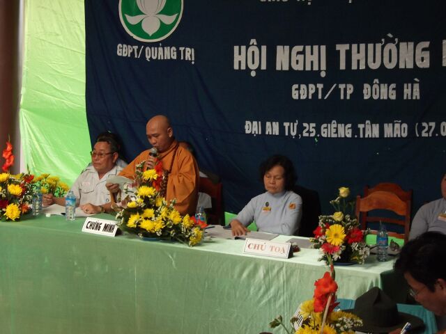 Huynh trưởng (Htr) cấp Tấn Lê Thị Diệu Tha – Phó trưởng phân ban GĐPT Quảng Trị, anh Hoàng Công Hiền – Htr cấp Tấn; Ủy viên Nghiên huấn, chị Nguyễn Thị Chớ – Htr cấp Tấn; Ủy viên Thiếu nữ chủ toạ hội nghị.