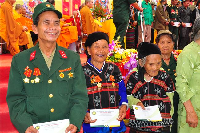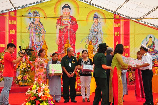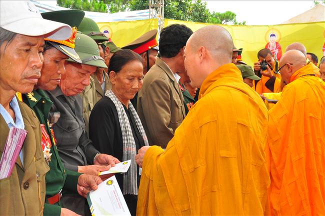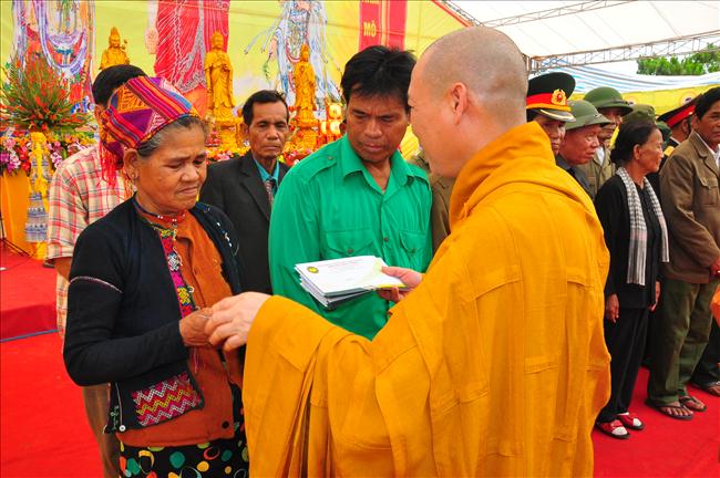Một trăm xuất quà từ thiện, tổng trị giá 100 triệu đồng được chư tôn đức tăng, đại diện chính quyền, tướng lĩnh trao tặng cho các gia đình chính sách, các hoàn cảnh khó khăn trong địa bàn huyện. Qua đây mọi người biết thêm thông tin: Bà con Vân Kiều được vinh dự mang họ Hồ là do Bác Hồ đặt cho.