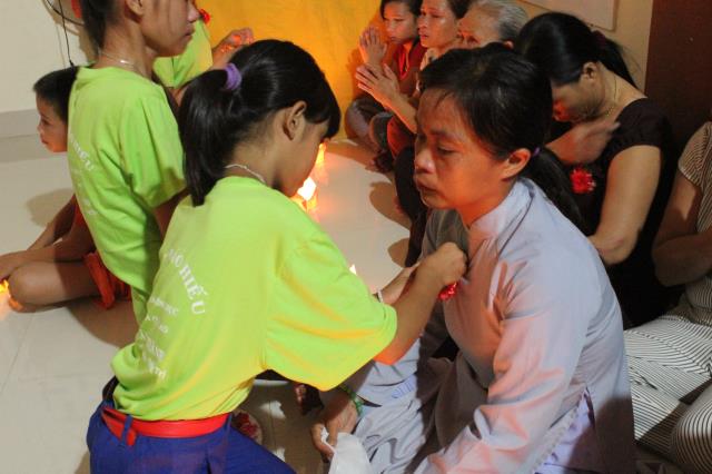 Đêm tri ân được bắt đầu với nghi thức cài hoa hồng lên chư tôn đức chứng minh và hội chúng, ghi nhận công ơn trời biển của mẹ cha.