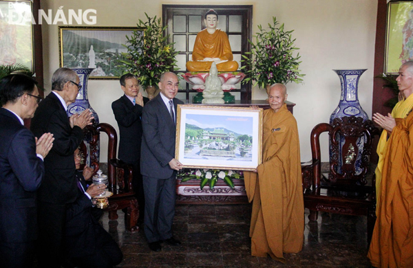 Đại diện cho chư tăng chùa Linh Ứng dâng tặng bức tranh toàn cảnh chùa tới Quốc vương Norodom Sihamoni.