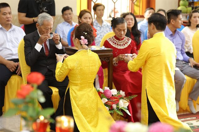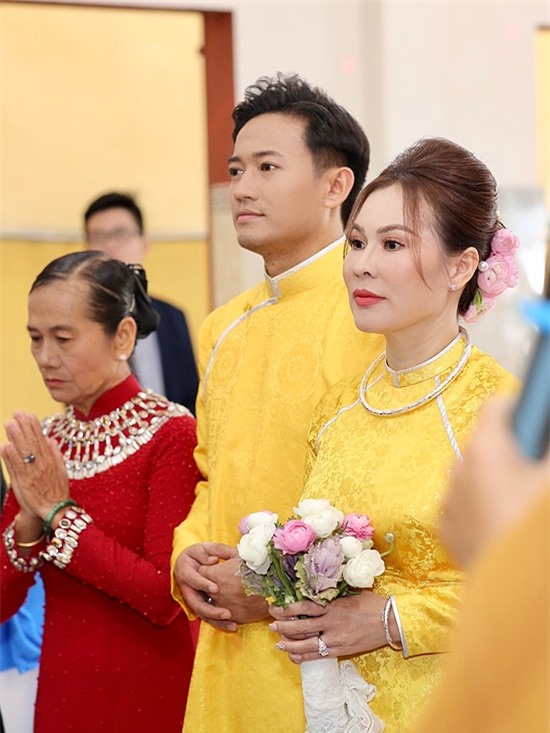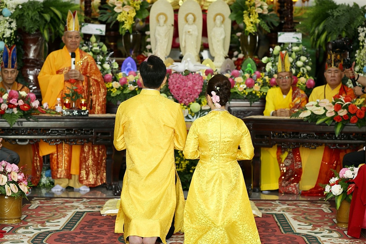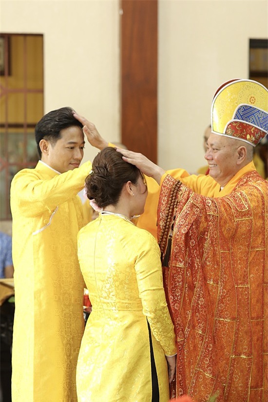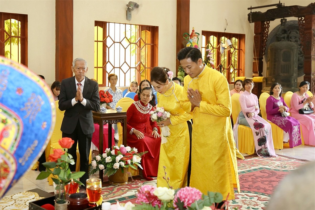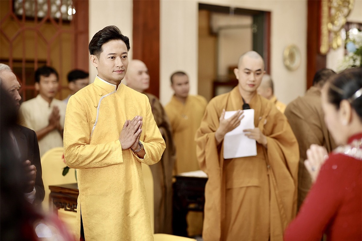 Diễn viên Quý Bình và bà xã doanh nhân Ngọc Tiền tổ chức lễ hằng thuận tại chùa Chơn Giác, TP HCM hôm 10/12.