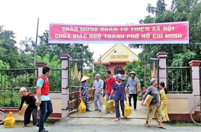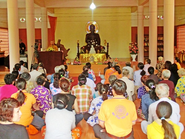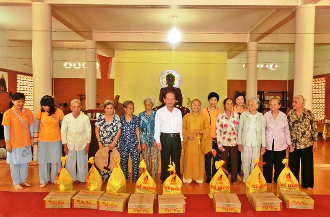 Dưới sự quan lâm chứng minh buổi lễ có : TT. Thích Nhật Từ, Chủ nhiệm quỹ ĐPNN, trụ trì chùa Giác Ngộ, Q.10. TP.CHM cùng 70 Phật tử và doanh nhân Mi Hồng.
