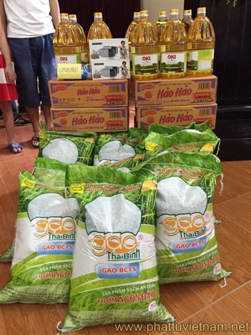 Mỗi phần quà gồm một 1 thùng mì, một bao gạo 10 kg, một can dầu ăn 3 lít, một phong bì 2 triệu đồng.