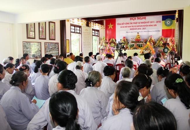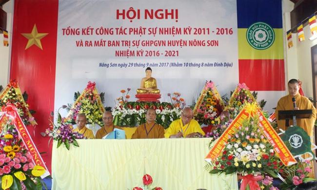 Theo bản báo cáo, toàn huyện Nông Sơn chỉ có 6 ngôi chùa, với 5 vị tăng, ni. Trong nhiệm kỳ (2011-2016), BTS PG huyện Nông Sơn đã thành tựu được những Phật sự như: đề xuất BTS PG tỉnh bổ nhiệm trụ chùa Quế Phước; còn chùa Viên Minh và chùa Kim Sơn BTS tỉnh đang trong quá trình xét hồ sơ bổ nhiệm trụ trì; hoàn thành việc bổ nhiệm 3 Ban hộ tự (chùa Thanh Phước, chùa Đại Bình, chùa Kim Sơn) và 2 Ban hộ trì Tam Bảo (chùa Viên Minh, chùa Quế Phước). Riêng đối với chùa Viên Quang, do tín đồ có kiến giải bất đồng nên Ban Trị Sự GHPGVN huyện trình Ban Trị Sự GHPGVN tỉnh về chủ trì giải quyết cử Ban hộ tự và đã ban hành quyết định chuẩn y, nay đã đi vào sinh hoạt ổn định.