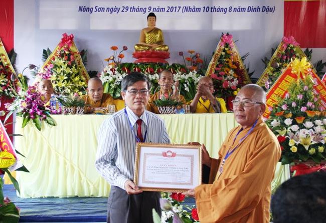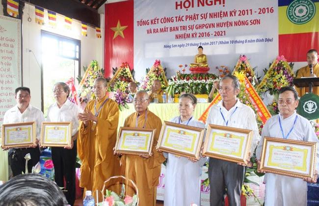 Dịp này, BTS và Phật tử huyện Nông Sơn có nhiều nỗ lực đóng góp trong công tác Phật sự đã được tuyên dương, khen thưởng: BTS GHPGVN tỉnh trao tặng bằng tuyên dương công đức cho 4 tập thể và 3 cá nhân; UBND – UBMT huyện tặng bằng khen thưởng cho 1 tập thể và 1 cá nhân.