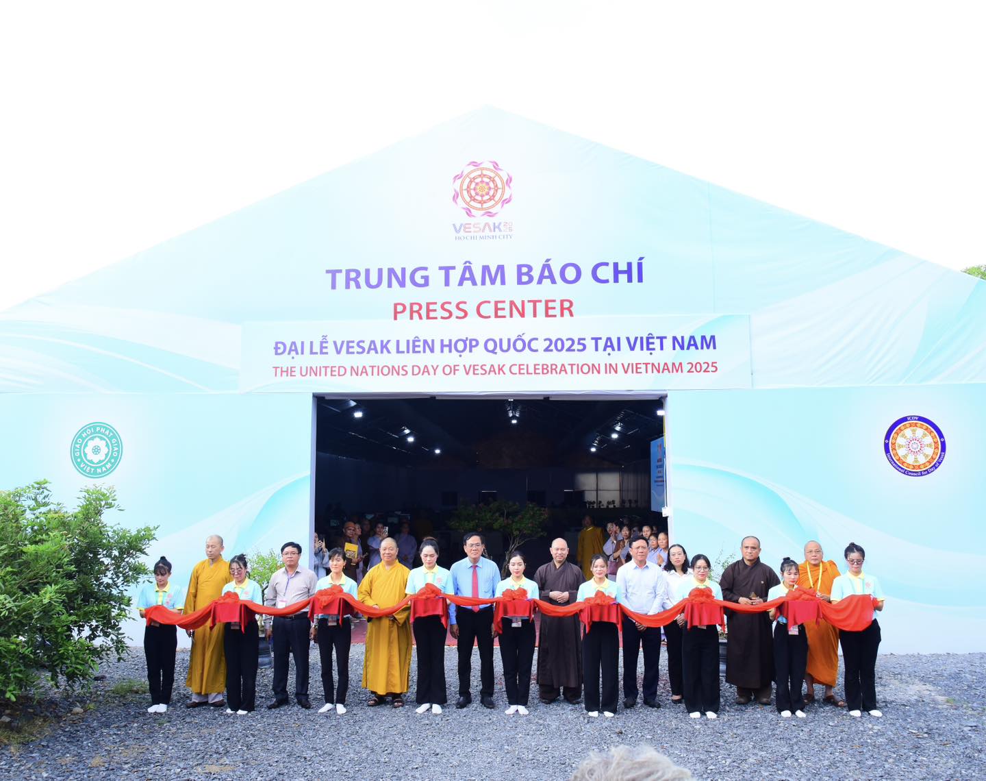 Trước khi buổi họp báo bắt đầu đã diễn ra lễ Khai mạc Trung tâm Báo chí, Ban tổ chức Đại lễ Vesak LHQ 2025 đã cắt băng khai trương.