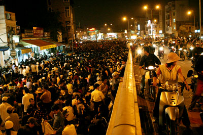 Công an phường Ngã Tư Sở đang làm nhiệm vụ giữ trật tự trên cầu vượt Ngã Tư Sở do lượng người đi lễ quá đông.