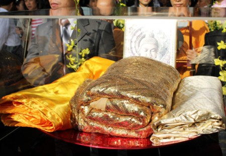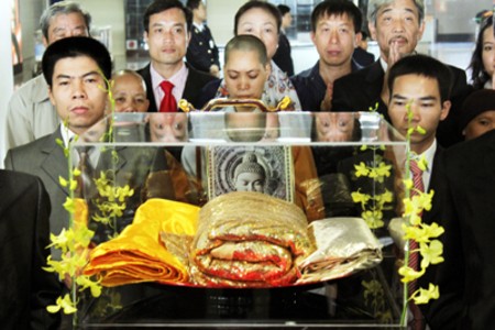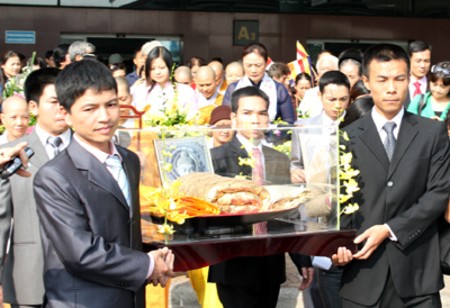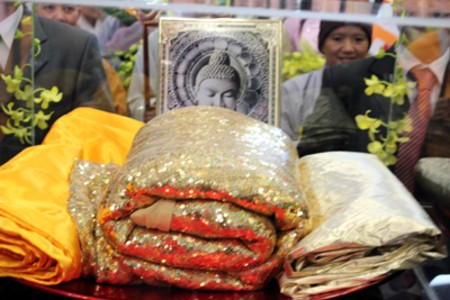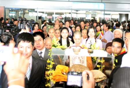 Đúng 14 giờ chiều hôm nay 9/11, chiếc Phi cơ chở đoàn hành hương vùng đất Phật từ Ấn Độ chính thức hạ cánh tại Sân bay Nội Bài, sau hơn 30 phút tiến hành các thủ tục hải quan, Lễ cung rước ba tấm Y (Áo cà sa) đã được thực hiện rất trang trọng với sự chứng kiến và làm lễ của hàng trăm tăng ni, Phật tử ngay tại khuôn viên cửa A sân bay Nội Bài.