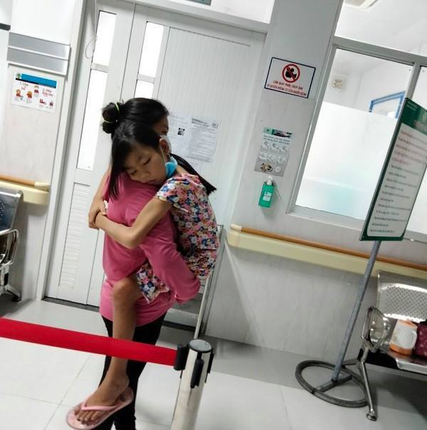 Trước đó một tuần, cả cha mẹ và bà ngoại của bé Yến Vy cũng bị dương tính với Covid-19 do lây nhiễm trong cộng đồng. Ở nhà chỉ còn con và em gái năm nay chuẩn bị lên lớp 2, là chị cả, cô bé cũng phải nén nỗi lo sợ để bảo vệ em gái. Thế nhưng cơ thể của con “gánh” đầy bệnh tật, chẳng biết có thể gắng gượng được đến lúc nào.