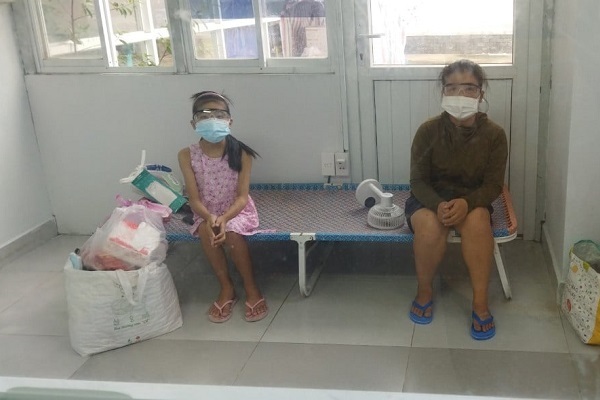 Hai mẹ con chị Trâm ở khu vực cách ly của Bệnh viện Nhi đồng 2 chờ kết quả xét nghiệm Covid-19.