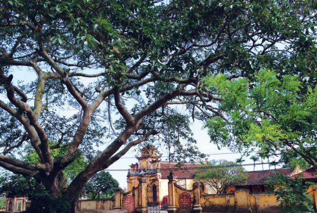 Ngôi nhà năm gian nằm theo chiều ngang nhỏ và thấp hơn, bà nội tôi bảo đấy là nơi thờ Mẫu. Nằm dọc phía sau nhà thờ Mẫu là ba gian nhà thờ Tổ và nơi ở của Sư cụ trụ trì chùa. Đằng sau những ngôi nhà là vườn chùa có trồng rất nhiều cây ăn quả. Bên cạnh sân chùa là chiếc ao rộng thả dày đặc bèo tấm làm thức ăn chăn nuôi. Cây đa, dáng như một ông già hiền từ, có gốc to lắm. Muốn leo trèo, chúng tôi phải công kênh nhau bám vào cành rồi đu người mới trèo được lên cây. Cây đa có nhiều cành, nhánh đua rộng ra xung quanh. Ngồi vắt vẻo trên cành đa, phóng tầm mắt nhìn thấy dãy núi đá vôi xanh mờ xa xa phía chân trời. Hình dung một không gian bao la, rồi đây những cánh chim ra ràng chúng tôi sẽ bay cao, bay xa.