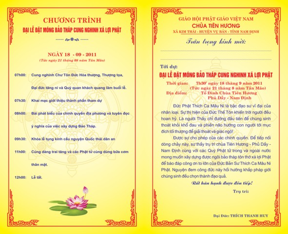 Để phục vụ cho sự nghiệp hoằng dương đạo pháp lợi lạc quần sinh, chùa Tiên Hương, Phủ Dầy, Nam Định xin trân trọng kính mời các quý Phật tử trong và ngoài nước bớt chút thời gian về tham dự buổi lễ để việc đặt móng xây dựng ngôi bảo tháp cung nghing ngọc xá lợi Phật được thập phần viên mãn.