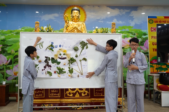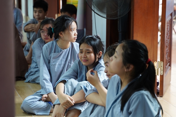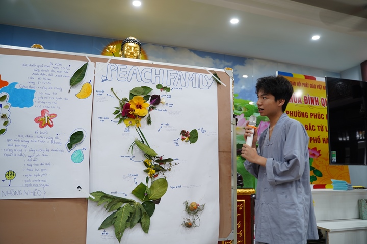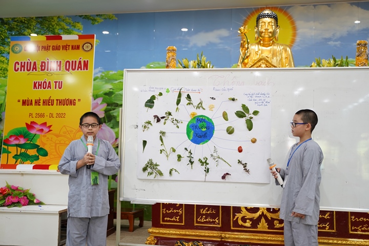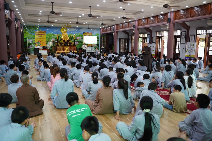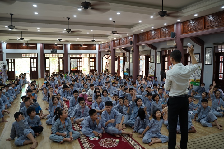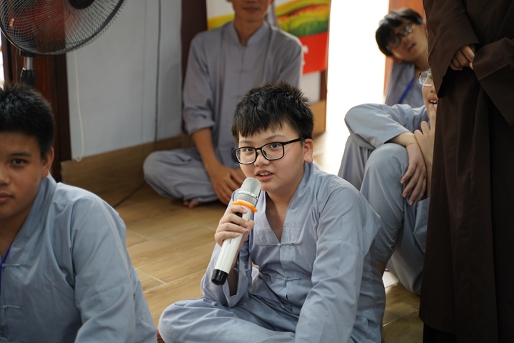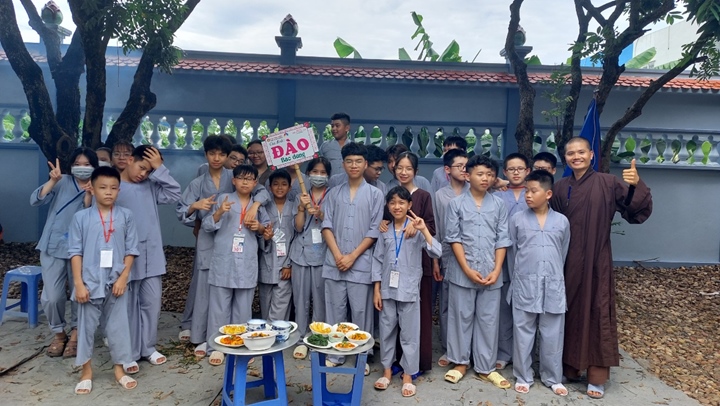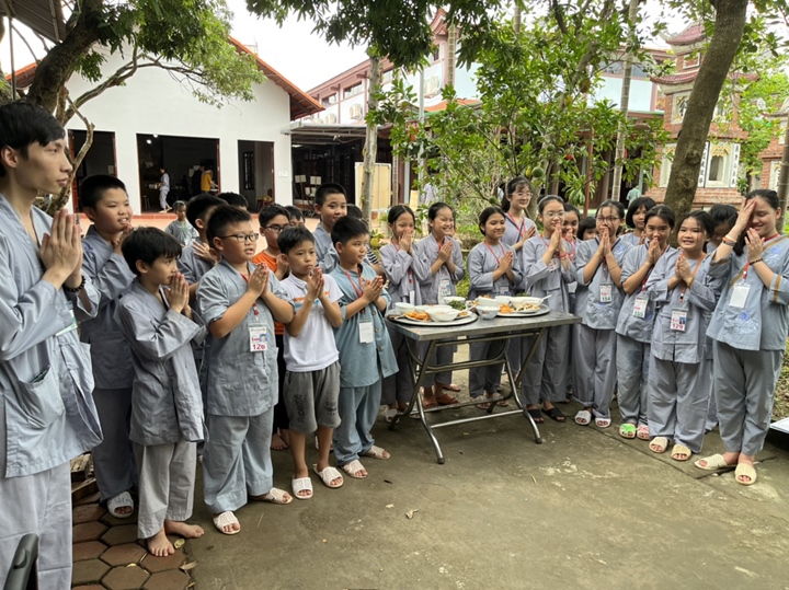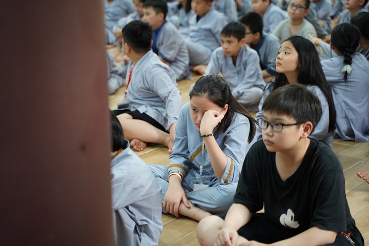 Đặc biệt hơn, Ban tổ chức khóa tu đã phân chia 320 tu sinh chia thành 10 chúng cụ thể dưới sự hướng dẫn của quý Thầy và các anh chị huynh trưởng, với những cái tên vô cùng dễ thương như: Xoài Hoan Hỷ, Nhãn Đức Hạnh, Nho Hạnh Phúc, Cam Đoàn Kết, Dừa Hiểu Thương, Đào Bao Dung, Bưởi Tinh Tiến, Mít Từ Bi, Mận Lắng Nghe, Táo Bình Yên. Dưới mái chùa thân thương, các chúng đã trải qua vô vàn những kỷ niệm đẹp bên quý thầy, bên các bạn đồng tu, trong những hoạt động vô cùng ý nghĩa như cùng nhau nấu ăn cúng dường quý Thầy, thi thuyết trình với chủ đề “bảo vệ môi trường”, thực tập ăn chay trong sự biết ơn và chính niệm…. Hơn nữa, các bạn thanh thiếu niên còn được quý Thầy cô chia sẻ, lắng nghe và giải đáp những khúc mắc trong cuộc sống, hướng dẫn cách kiểm soát cơn giận, xử lý nhẹ nhàng trước những stress trong cuộc sống thường ngày, học cách yêu thương và biết nói lời cảm ơn – xin lỗi với mẹ cha và những mối quan hệ xung quanh.
