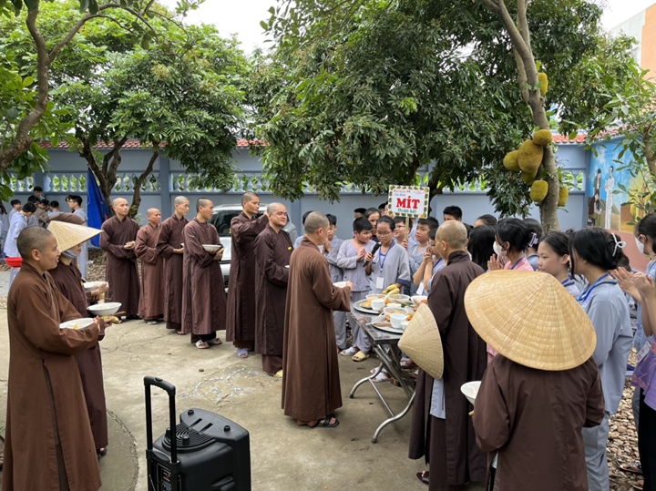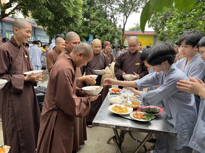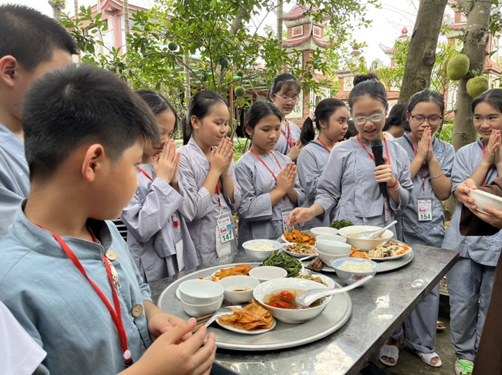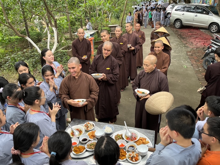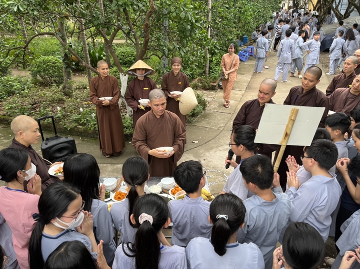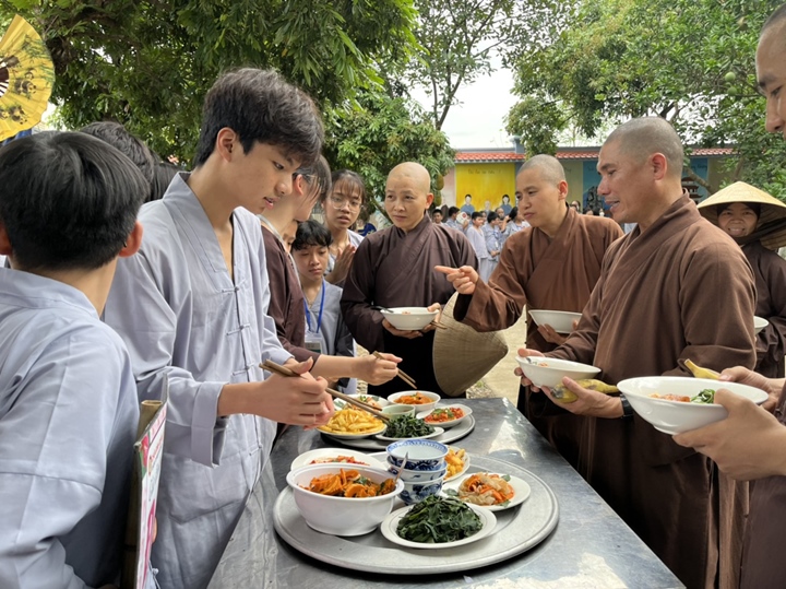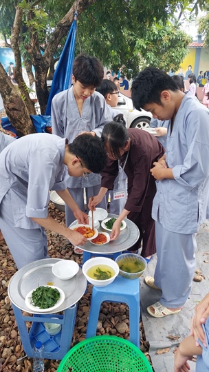 Bữa trưa, các bạn xếp hàng ngay ngắn lấy đồ ăn và thực hiện nghi thức cúng Quá Đường