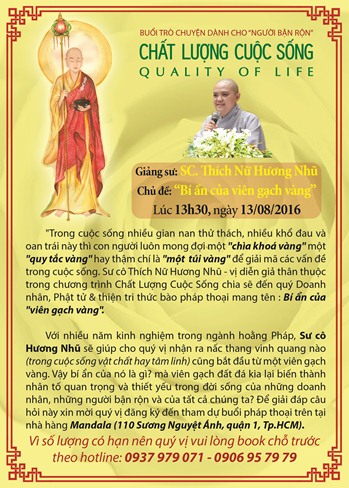 Trong cuộc sống nhiều gian nan thử thách, nhiều khổ đau và oan trái này thì con người luôn mong đợi một “chìa khoá vàng” một “quy tắc vàng” hay thậm chí là “một túi vàng” để giải mã các vấn đề trong cuộc sống. Sư cô Hương Nhũ sẽ giúp cho quý vị nhận ra nấc thang vinh quang nào (trong cuộc sống vật chất hay tâm linh) cũng bắt đầu từ một viên gạch vàng. Vậy bí ẩn của nó là gì? mà viên gạch đất đá kia lại biến thành nhân tố quan trọng và thiết yếu trong đời sống của tất cả chúng ta?
