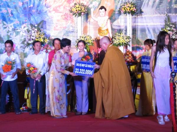 Qua tổng kết, Ban tổ chức đã công bố tổng số tiền các mạnh thường quân, nhà hảo tâm, công ty… đóng góp trong đêm diễn ra Đại lễ là 1.245 triệu đồng. Theo Ban tổ chức, qua 3 năm thực hiện Chương trình “ Nhịp cầu nhân ái” , do Chùa Khánh Sơn phối hợp với Đài PTTH Sóc Trăng thực hiện, đã nhận được các doanh nghiệp, các nhà hảo tâm, bà con phật tử gần xa đóng góp, hỗ trợ kịp thời cứu giúp trên 400 gia có hoàn cảnh khó khăn, bệnh tật, người già neo đơn… Với số tiền 2 tỷ 545 triệu đồng.